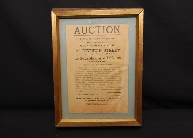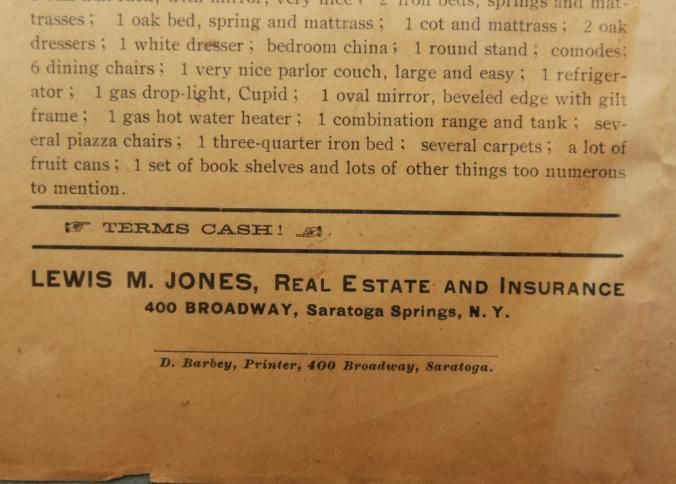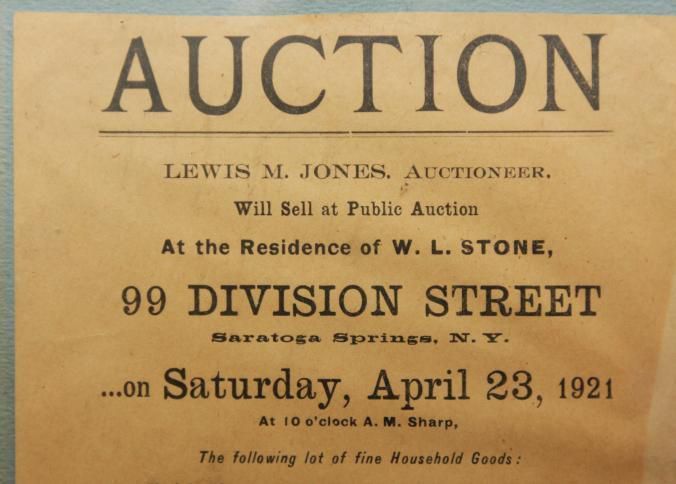 FR BROADSIDE, HOUSEHOLD, 1921, NY. LEWIS JONES, AUCTIONEER. SARATOGA SPRINGS, NY. 9" X 11"