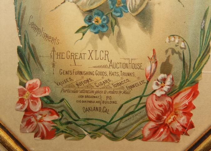 FR ADVERTISING, COLOR PRINT, WOMAN AND FLOWERS, COMPLIMENTS THE GREAT XLCR AUCTION HOUSE, GENTS FURNISHING GOODS, HATS, TRUNKS, ETC. OAKLAND, CA. 9" X 11 OCTAGONAL FRAMECreated By