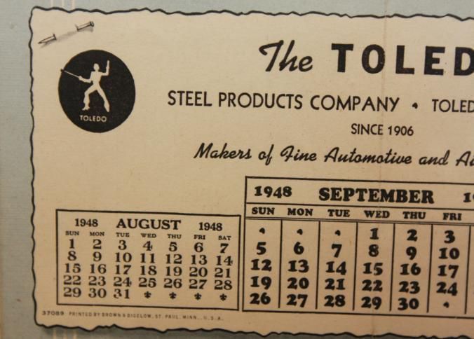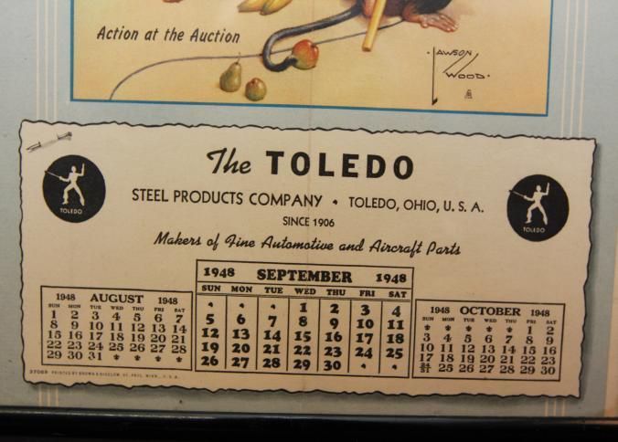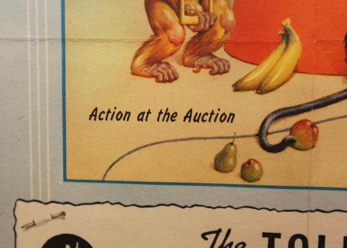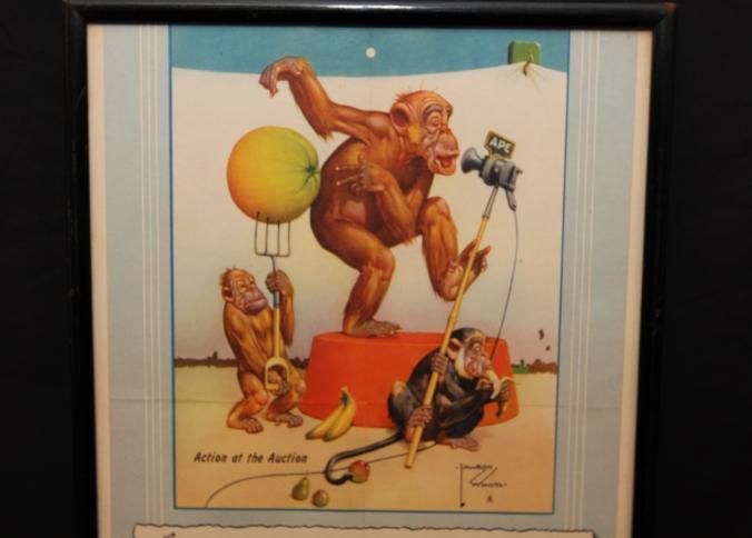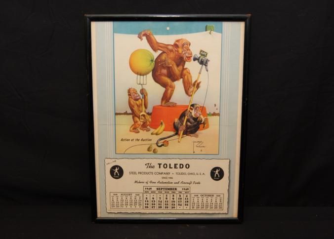 FR ADVERTISING CALENDAR, 1948, OH. "ACTION AT THE AUCTION" MONKEY AT MICROPHONE SELLING FRUIT THAN ANOTHER MONKEY IS HOLDING ON A PITCHFORK. THE TOLEDO STEEL PRODUCTS COMPANY. 10 1/4" X 12 3/4"Created By