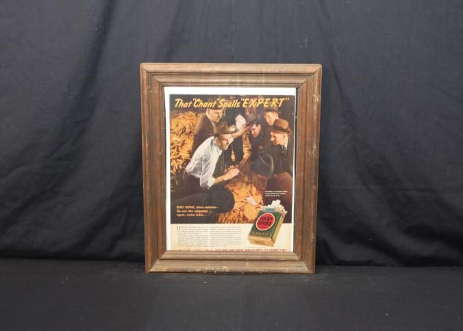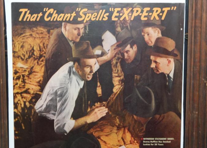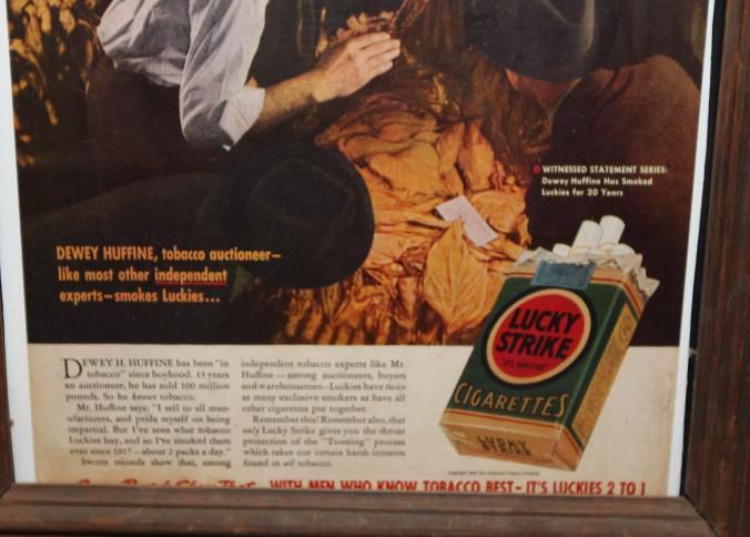 FR AD, NO DATE. COLOR PHOTO AUCTIONEER AND CROWD, TOBACCO. "DEWEY HUFFINE, TOBACCO AUCTIONEER - LIKE MOST OTHER INDEPENDENT EXPERTS - SMOKES LUCKIES" 14 3/4" X 17"Created By