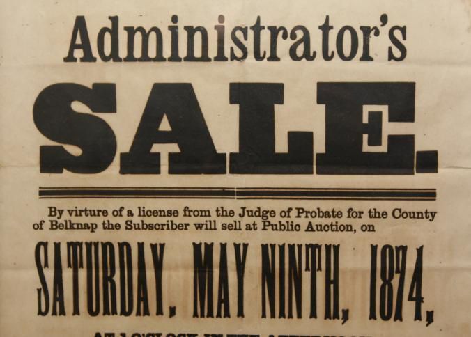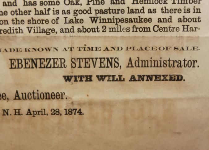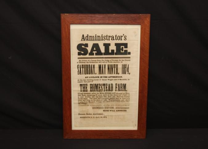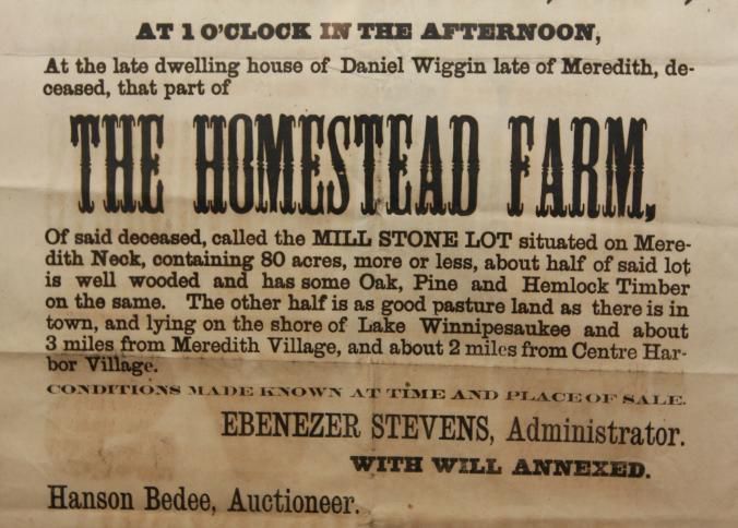 FR BROADSIDE, 1874, NH. ESTATE SALE, MEREDITH NECK. HOMESTEAD FARM, HANSON BEDEE, AUCTIONEER. 15" X 21"Created By