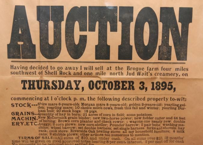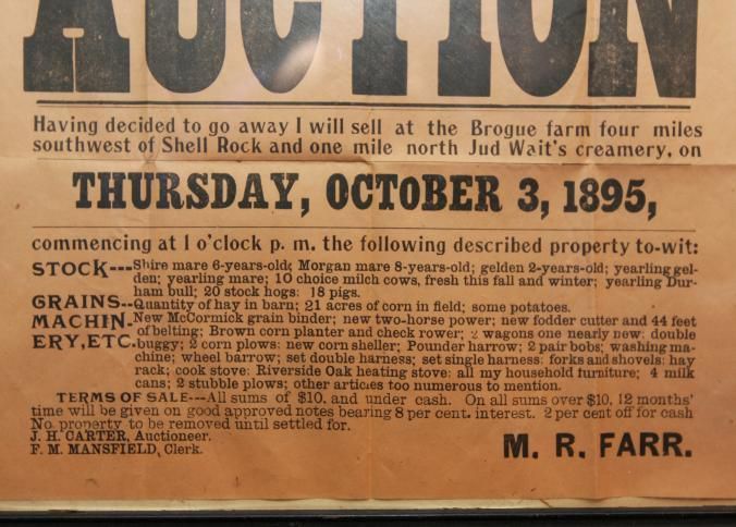 FR. 1895 IA. FARM AUCTION BROADSIDE. 9X12". AUCTIONEER J.H. CARTER WAS SELLING THE CONTENTS OF M.R. FARR'S FARM AT THE BROGUE FARM 4 MILES SOUTHWEST OF SHELL ROCK AND ONE MILE NORTH OF JUD WAIT'S CREAMERY ON THURS. OCT. 3, 1895 AT 1 O'CLOCK. INCLUDED IN THE LISTING WAS STOCK, GRAINS, MACHINERY, ETC. GREAT DETAILED LISTING. TERMS: ALL SUMS OF $10 AND UNDER CASH. $10. AND OVER 12 MONTHS TIME WITH APPROVED NOTES BEARING 8% INTEREST. 2% OFF FOR CASH.Created By