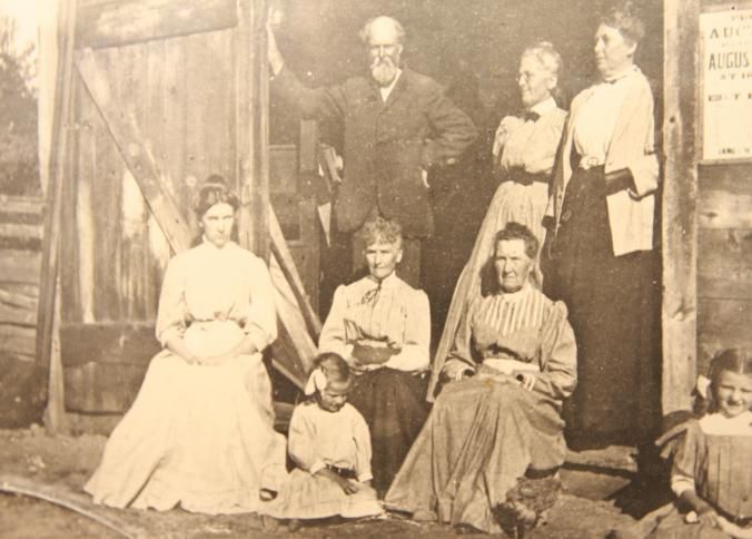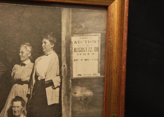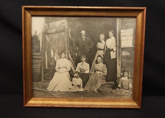 FR PHOTO, FAMILY OUTSIDE BARN WITH SIGN: AUCTION, AUG 22, '08. LOOKS LIKE 1808. 7 1/2" X 6"