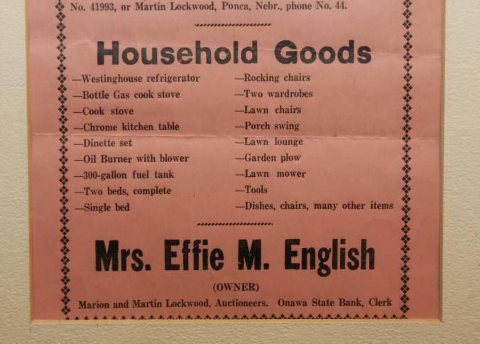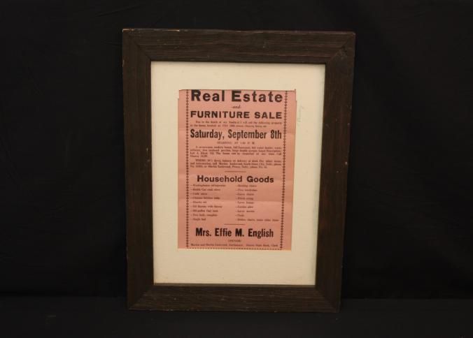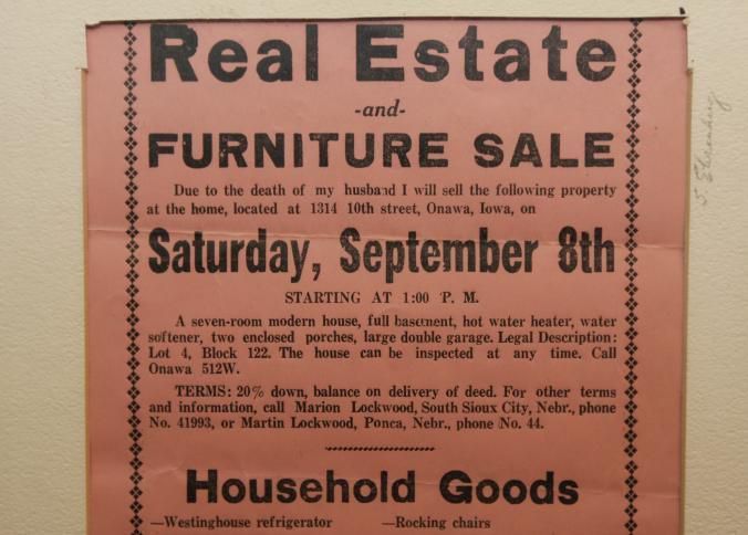 FR. C-1920'S IA. REAL ESTATE & FURNITURE AUCTION BROADSIDE. 7X10". "DUE TO THE DEATH OF MY HUSBAND I WILL SELL THE FOLLOWING PROPERTY AT THE HOME LOCATED AT 1314 10TH ST. ONAWA, IOWA ON SAT. SEPT. 8TH AT 1PM A 7 ROOM MODERN HOUSE, (DETAILED DESCRIPTION) HOUSEHOLD GOODS ( NICE LIST) MRS. EFFIE M. ENGLISH OWNER" THE AUCTIONEERS WERE MARION AND MARTIN LOCKWOOD.Created By