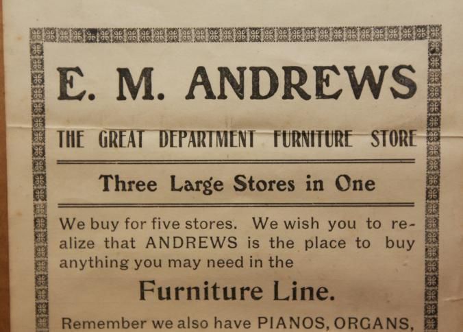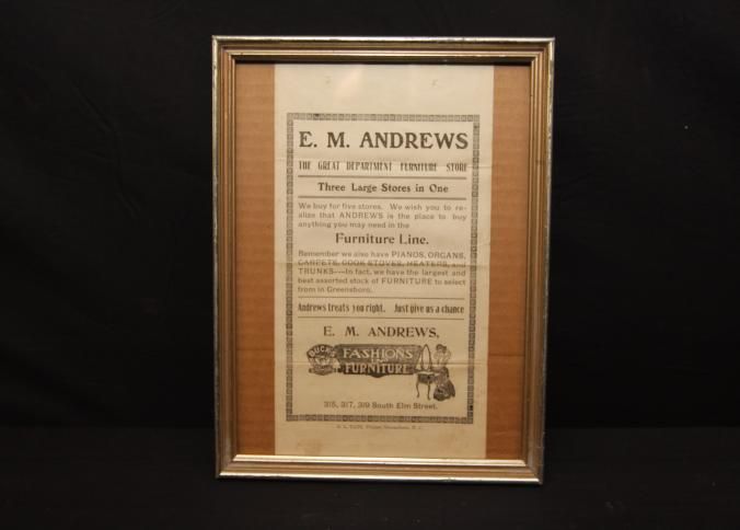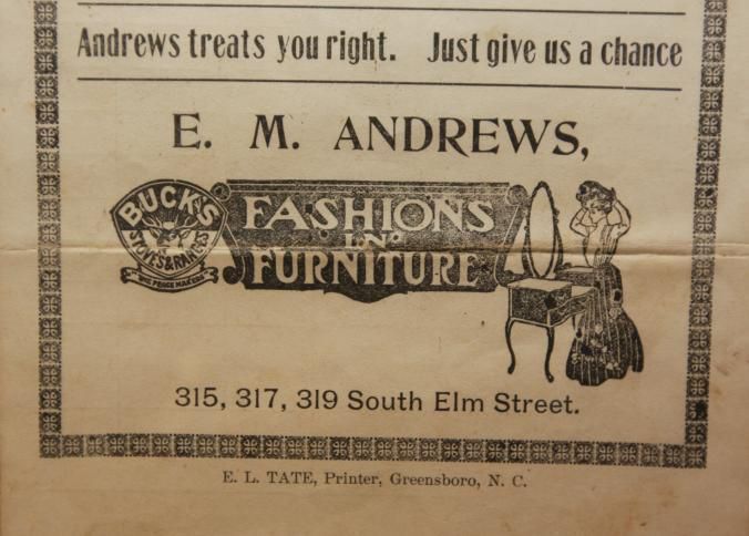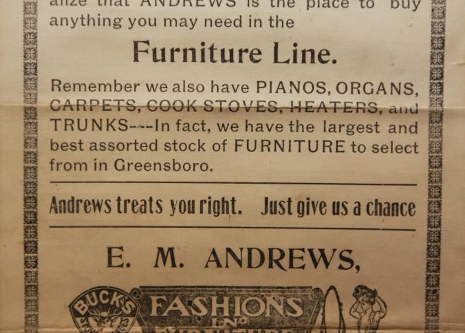 FR AD, E.M. ANDREWS THE GREAT DEPARTMENT FURNITURE STORE. THREE LARGE STORES IN ONE. ANDREWS TREATS YOU RIGHT. JUST GIVE US A CHANCE, FASHIONS AND FURNITURE. GREENSBORO, NC. 8 1/2" X 11"Created By