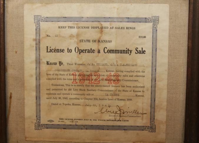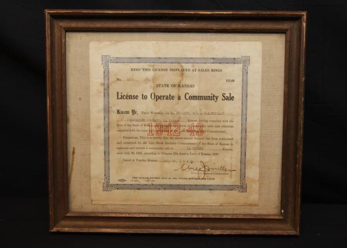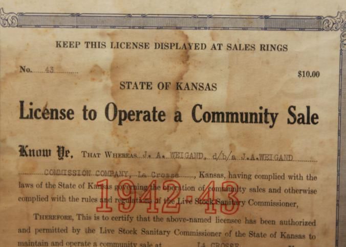 FR DOC, LICENSE, 1942, KS. STATE OF KANSAS LICENSE TO OPERATE A COMMUNITY SALE. J.A. WEIGAND COMMISSION COMPANY. 11 1/4" X 9 1/4"Created By