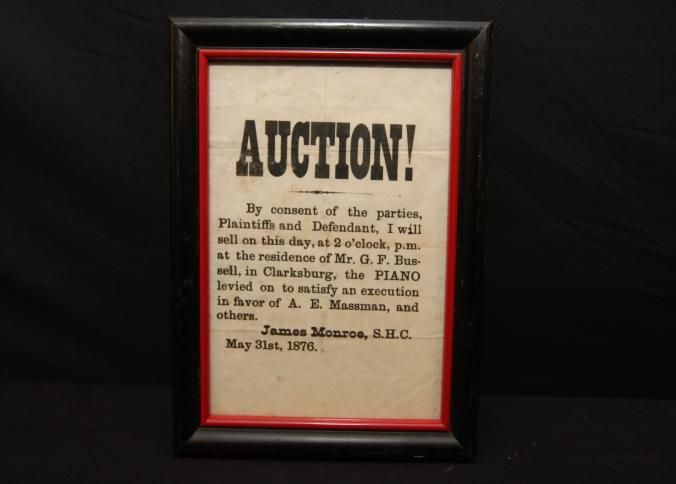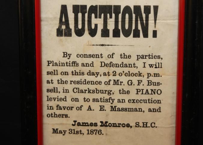FR BROADSIDE, 1876, AUCTION! PIANO LEVIED ON TO SATISFY AN EXECUTION IN FAVOR OF A.E. MASSMAN AND OTHERS. JAMES MONROE, S.H.C 6" X 8"Created By