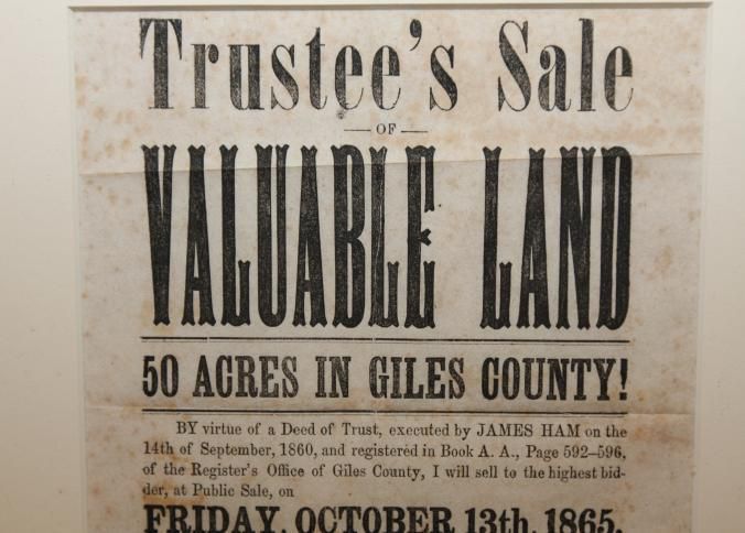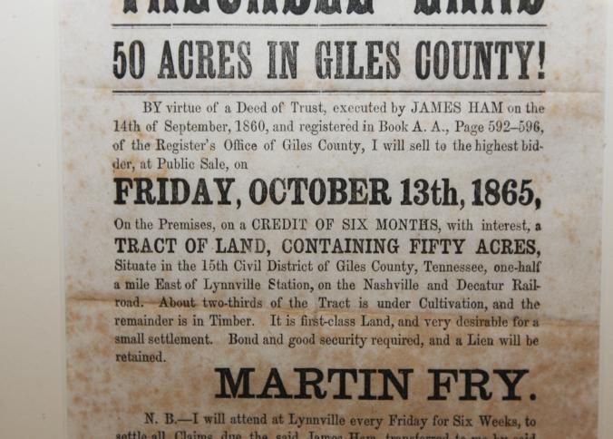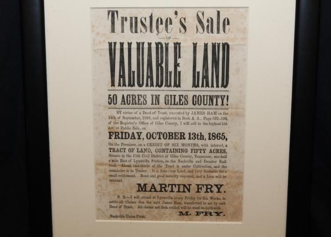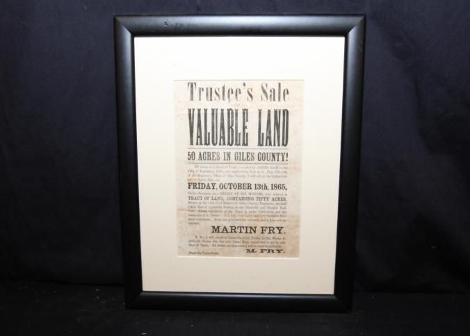 FR BROADSIDE, 1865, TN. TRUSTEE'S SALE OF VALUABLE LAND IN GILES COUNTY. MARTIN FRY. 11 1/2" X 13 1/2"Created By