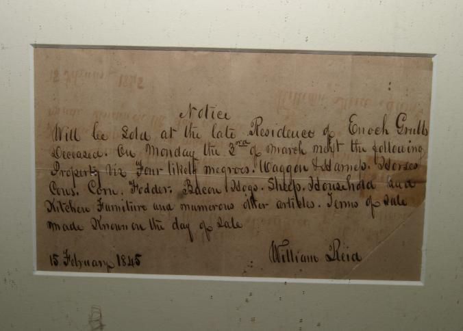FR BROADSIDE, SLAVE, 1845, HANDWRITTEN. NOTICE, WILL BE SOLD AT THE LATE RESIDENCE OF ENOCH GRULB, DECEASED. … FOLLOWING PROPERTY HIS FOUR LIKELY NEGROES, WAGGON & HARNESS, HORSES, COWS, CORN, ETC. 16 1/2" X 14 1/2"Created By