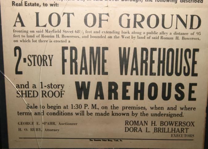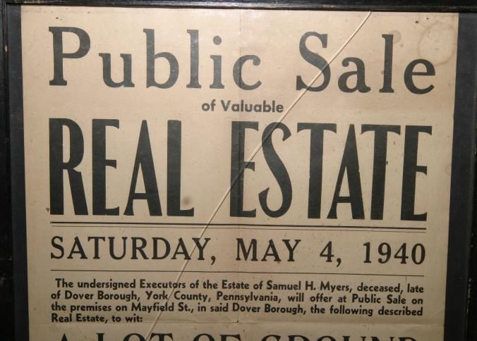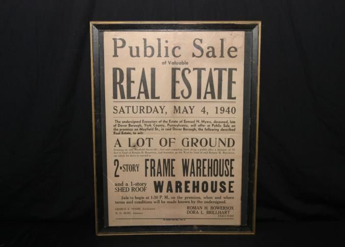 FR BROADSIDE, 1940, PA. PUBLIC SALE OF VALUABLE REAL ESTATE. A LOT OF GROUND, 2-STORY FRAME WAREHOUSE, 1 STORY SHED ROOM WAREHOUSE. GEORGE E. SPAHR, AUCTIONEER. 19" X 23 1/4"Created By