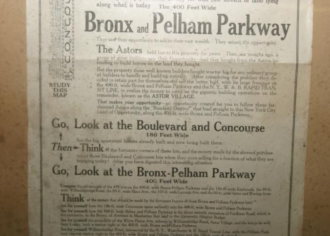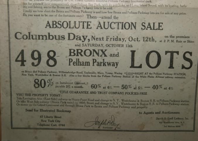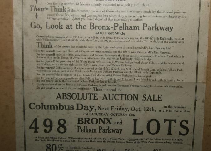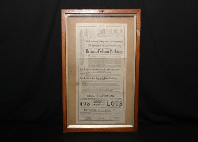 FR BROADSIDE, NY. "ROADS OF DESTINY" LEADING TO THE LAND OF OPPORTUNITY. BRONX AND PELHAM PARKWAY LOTS. ABSOLUTE AUCTION SALE. JACOB & EMIL LEITNER, INC, AUCTIONEERS. 18" X 26 3/4"Created By
