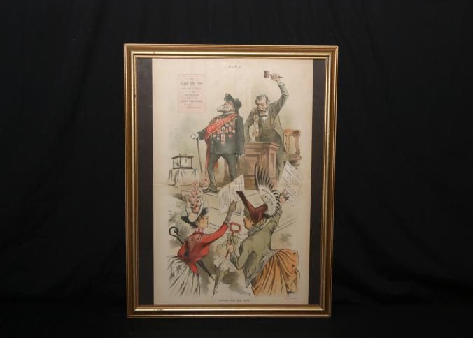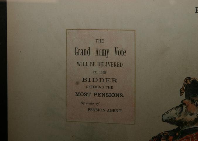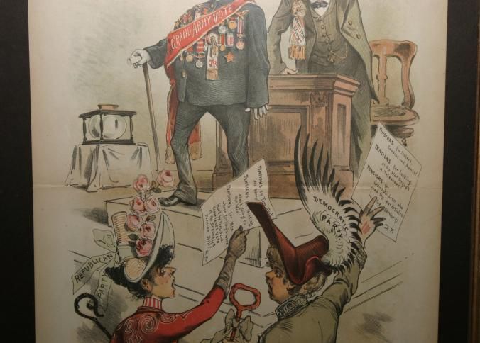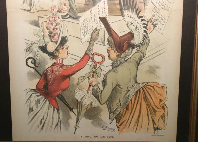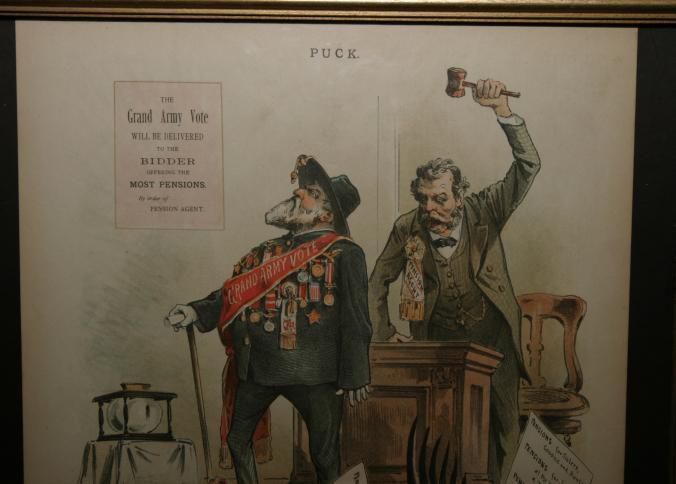 FR COLORED PRINT, POLITICAL. "BIDDING FOR HIS VOTE" TWO WOMEN IN FOREGROUND WAVING AGENDAS, PENSION AGENT WITH GAVEL. "THE GRAND ARMY VOTE WILL BE DELIVERED TO THE BIDDER OFFERING THE MOST PENSIONS BY ORDER OF PENSION AGENT - SIGN ON WALL. 17 3/4" X 21 1/2"Created By