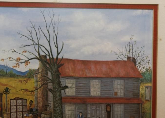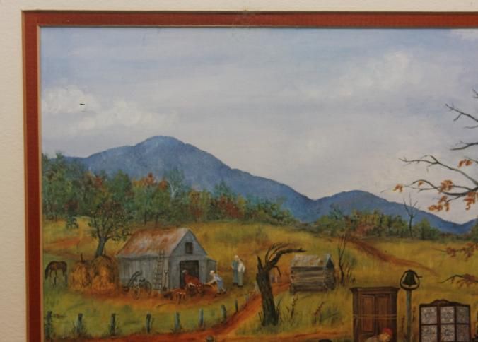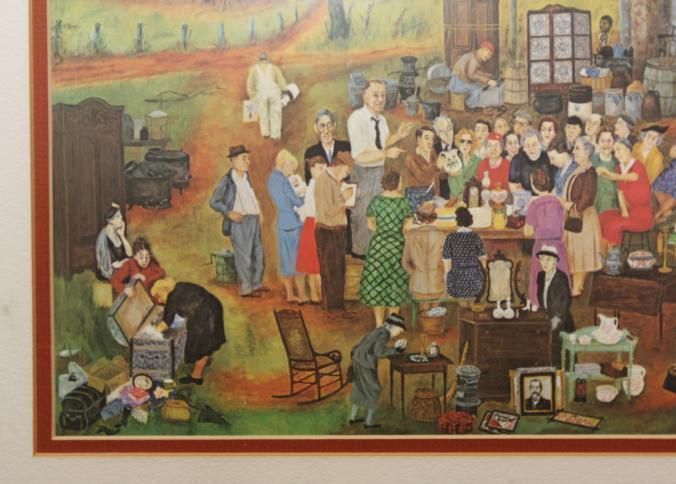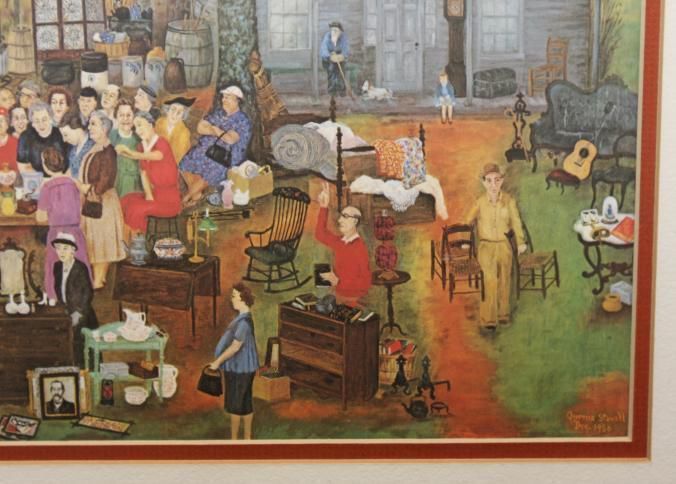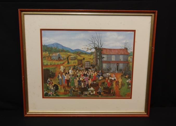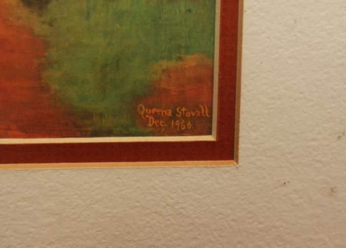 FR. COLORFUL "COUNTRY AUCTION" PRINT. SIGNED "QUEENA STOVALL 1960" 11X15 1/2" DOUBLE MATTED AND FRAMED TO 17 1/2X22 1/2". aUCTIONEER WITH TIE ON SELLING TO A CROWD OF MOSTLY WOMEN ON-SITE AT A FARM. pEOPLE PREVIEWING, BIDDING, LOADING OUT. TYPICAL KIDS AND PETS ON-SITE. GREAT DETAILS. A WONDERFUL FALL AUCTION SCENE.Created By