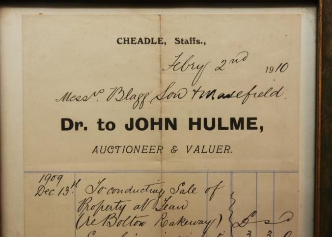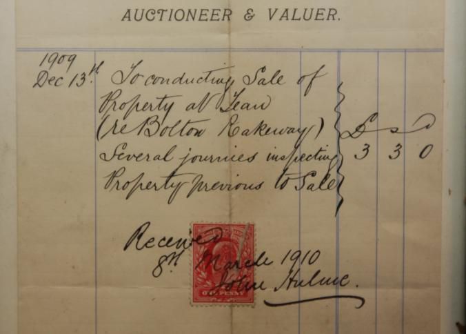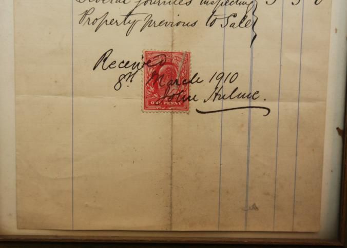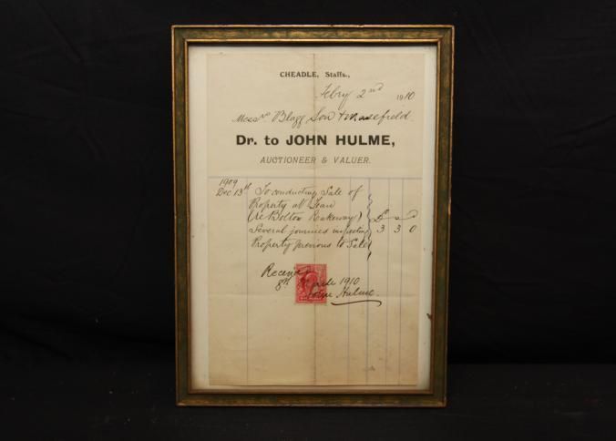 FR DOC, RECEIPT, 1910, JOHN HULME, AUCTIONEER AND VALUER. 6 1/2" X 8 1/2"