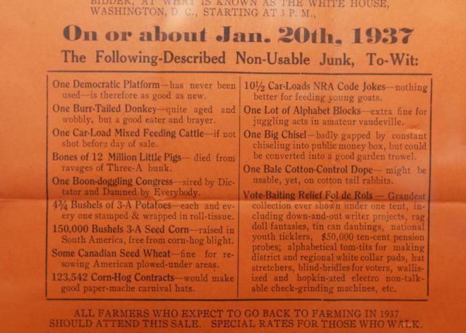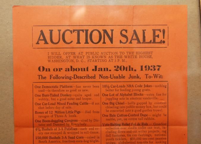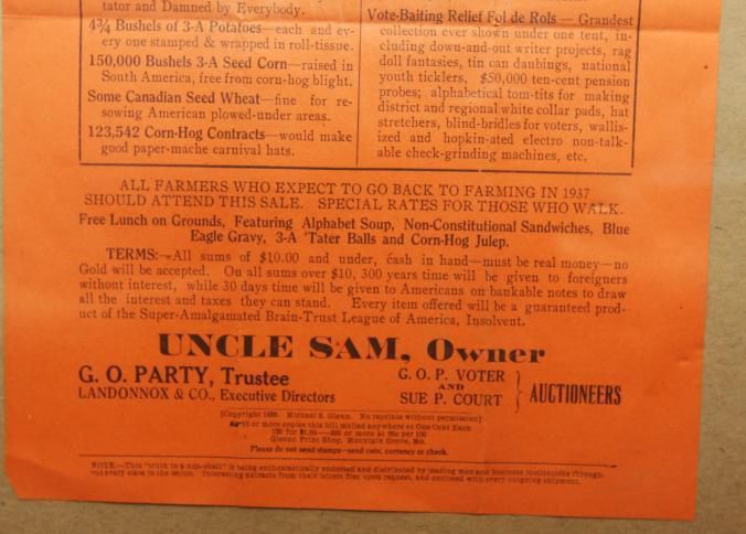 FR BROADSIDE, 1937, WASHINGTON DC. POLITICAL, 1 DEMOCRATIC PLATFORM, 1 BURR-TAILED DONKEY, ONE BOON-DOGGLING CONGRESS… ETC. UNCLE SAM, OWNER. G.O.P VOTER AND SUE P. COURT, AUCTIONEERS. 12" X 15"Created By