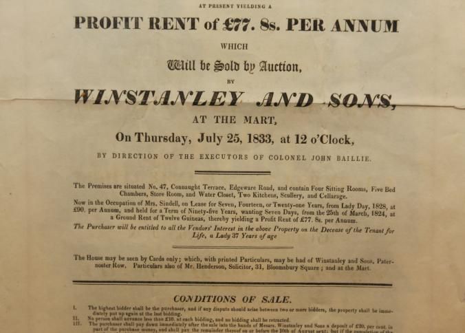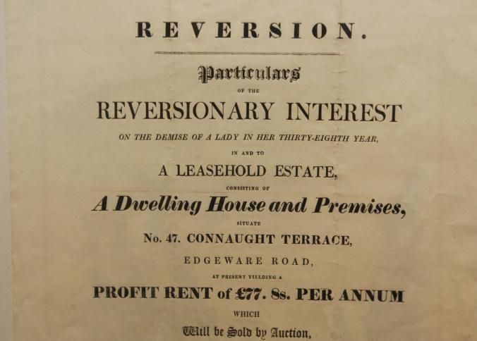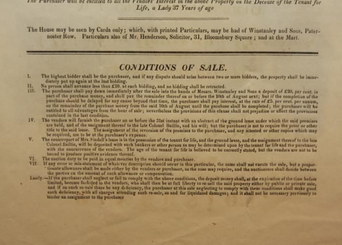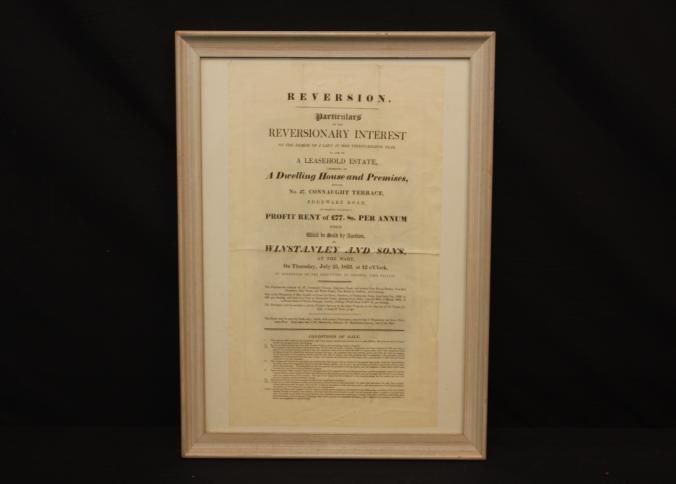FR BROADSIDE. 1833, PARTICULARS OF THE REVERSIONARY INTEREST ON THE DEMISE OF A LADY IN HER 38TH YEAR, IN AND TO A LEASEHOLD ESTATE CONSISTING OF A DWELLING HOUSE AND PREMISES. WINSTANLEY AND SONS, AUCTIONEERS. 13 1/2" X 17 1/2"Created By