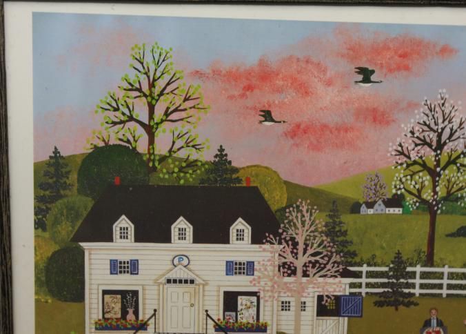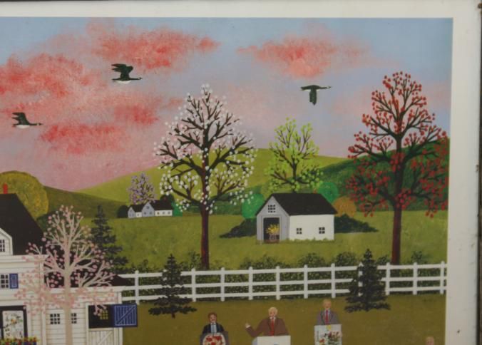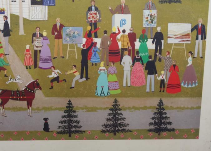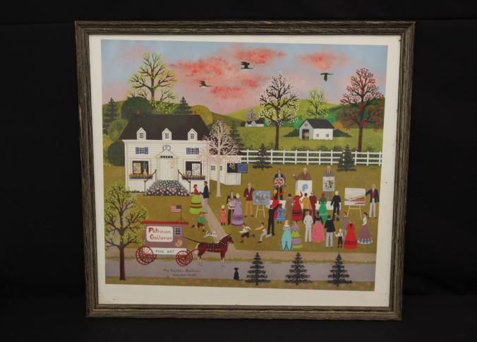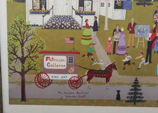 FR. CONTEMPORARY PRINT "THE GARDEN AUCTION" BY WOOSTER SCOTT. 17X20". VERY COLORFUL WITH DETAIL OF WELL DRESSED AUCTIONEER AND STAFF, BIDDERS, CHILDREN, DOG, HORSEDRAWN "PATRICIAN GALLERIES FINE ART" DELIVERY WAGON.Created By