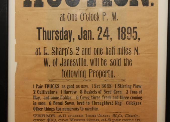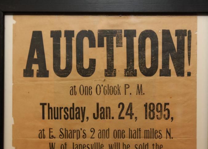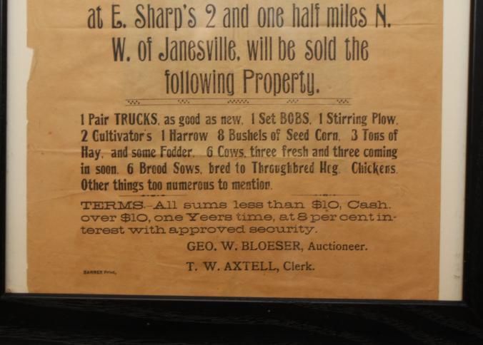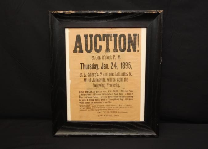 FR BROADSIDE, 1895, JANESVILLE. AUCTION! FARM EQUIPMENT. GEO. W. BLOESER, AUCTIONEER. 14" X 15"