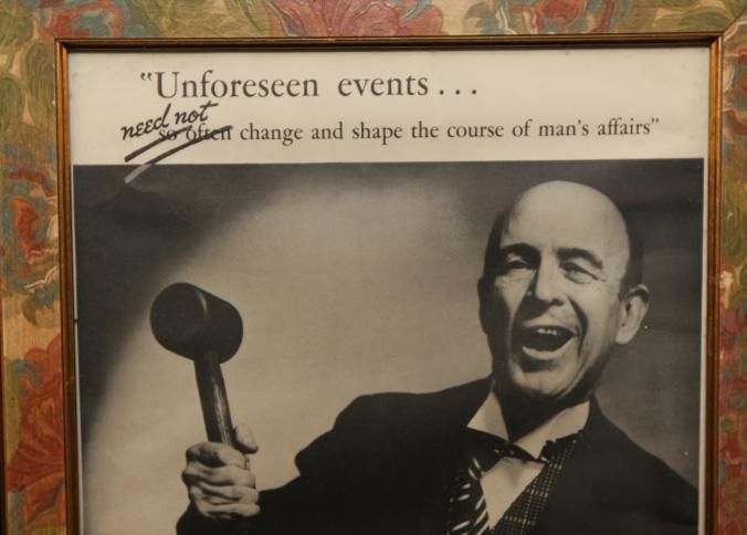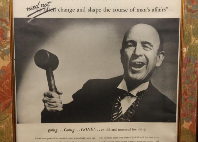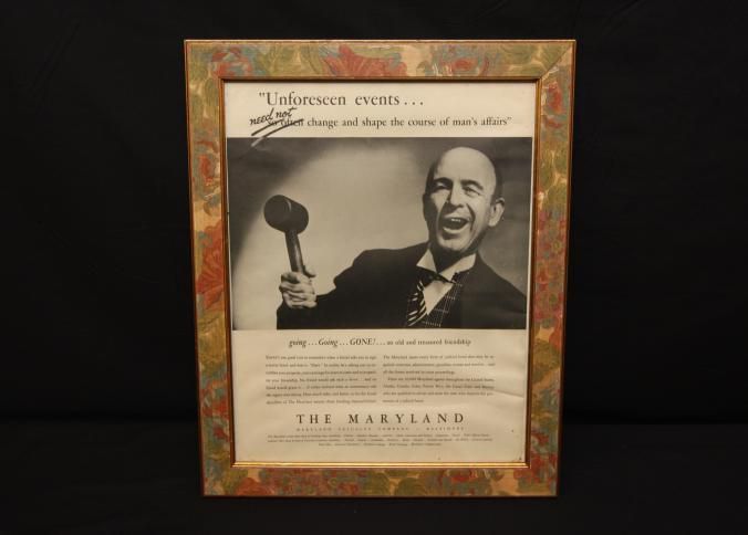 FR AD, "UNFORESEEN EVENTS… NEED NOT CHANGE AND SHAPE THE COURSE OF A MAN'S AFFAIRS" THE MARYLAND CASUALTY COMPANY, BALTIMORE, MD. B/W PHOTO OF AUCTIONEER AND GAVEL. 14" X 16"Created By