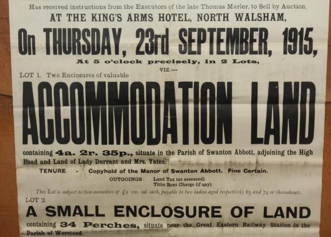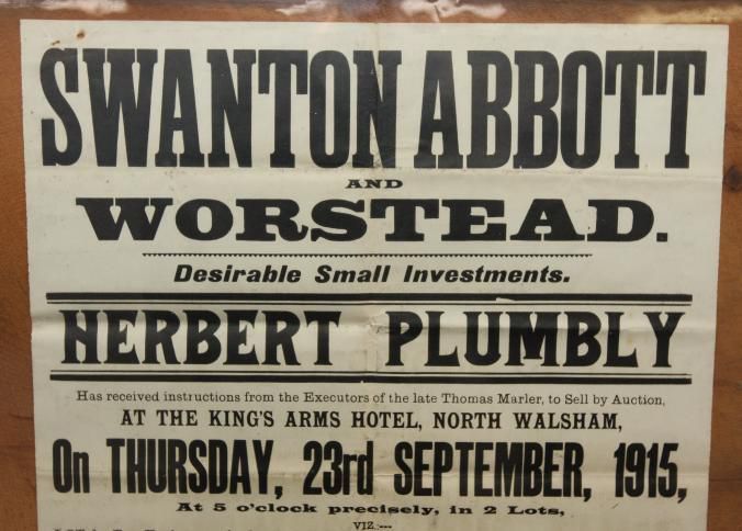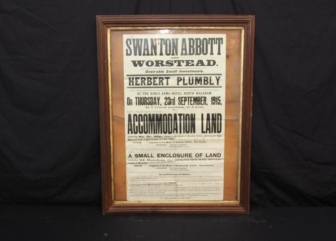 FR BROADSIDE, 1915, SWANTON ABBOTT AND WORSTEAD ACCOMMODATION LAND. DESIRABLE SMALL INVESTMENTS. HERBERT PLUMBLY, AUCTIONEER. 26" X 32"Created By