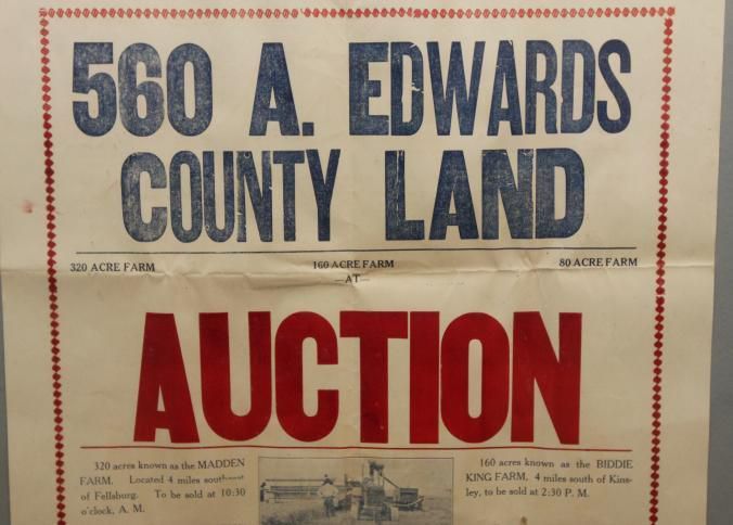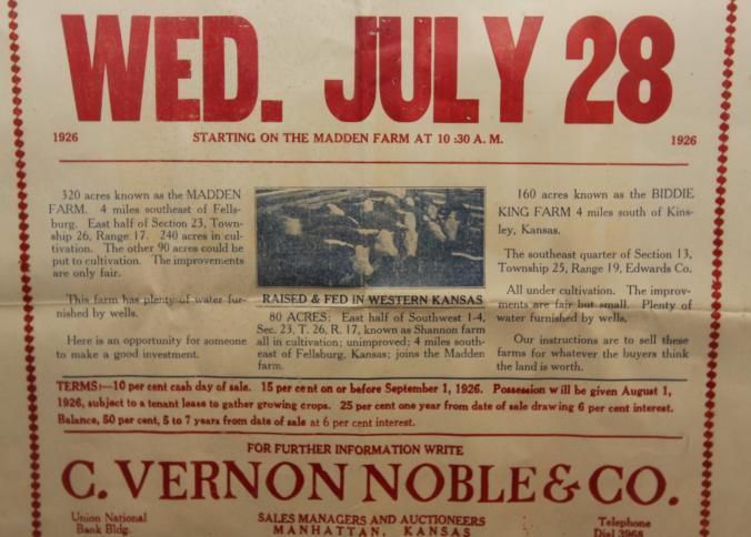 FR BROADSIDE, 1926, LAND, KS. 560 A. EDWARDS COUNTY LAND. 3 FARMS AT AUCTION. C. VERNON NOBLE & CO., AUCTIONEERS. 17" X 28"Created By