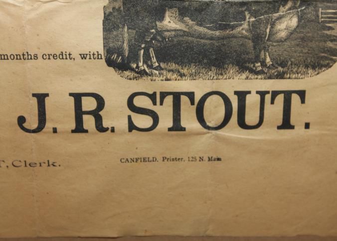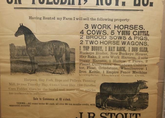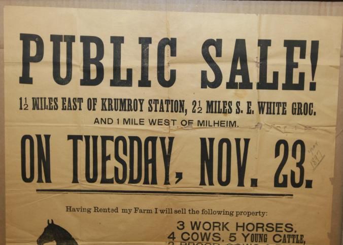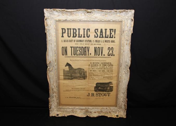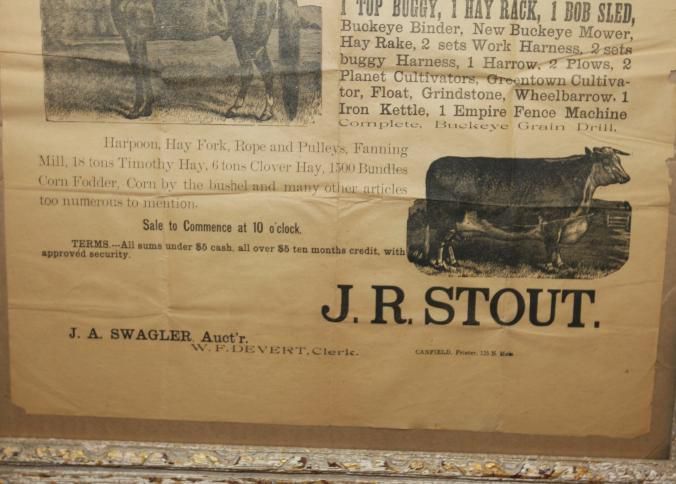 FR BROADSIDE, 1897, FARM, MILHEIM. LIVESTOCK, WAGONS, EQUIPMENT. J.A. SWAGLER, AUCTIONEER. B/W ILLUS WITH HORSE AND BULL. 25" X 31"Created By