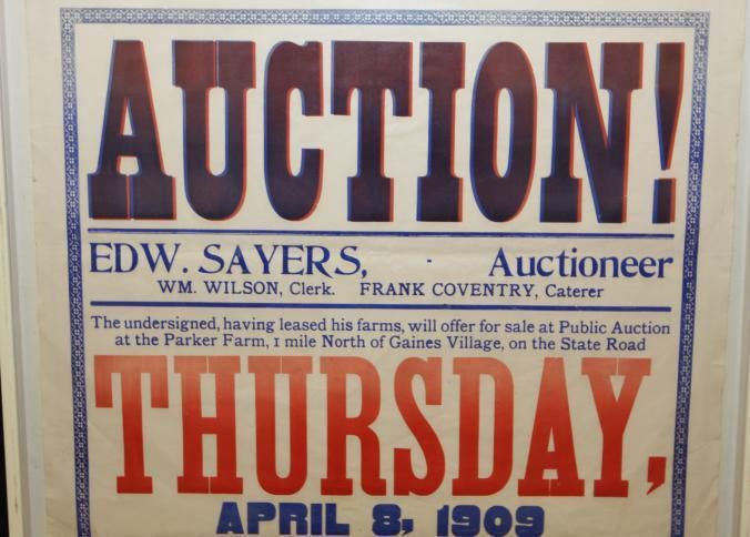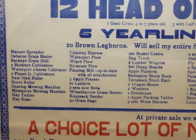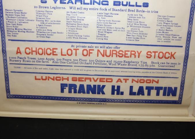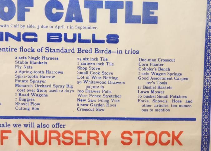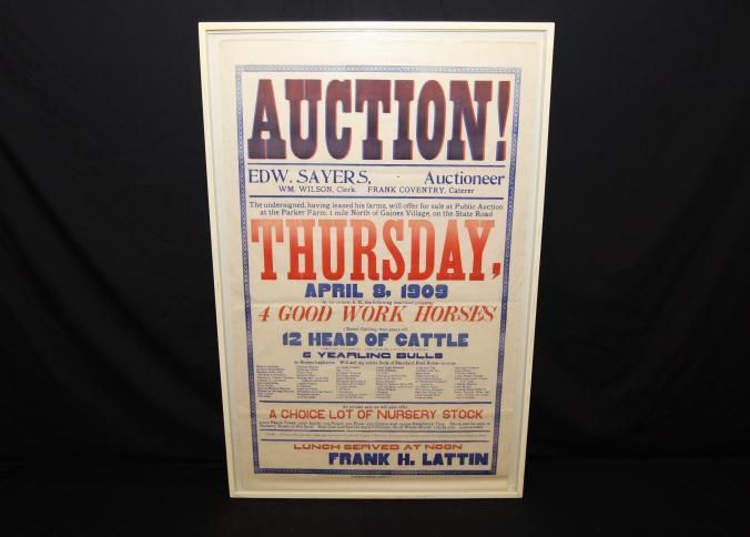 FR BROADSIDE, 1909, NY. LIVESTOCK. EDW. SAYERS, AUCTIONEER. 4 GOOD WORK HORSES, 12 HEAD OF CATTLE, 5 YEARLING BULLS, FRUIT TREES. 28" X 40"Created By