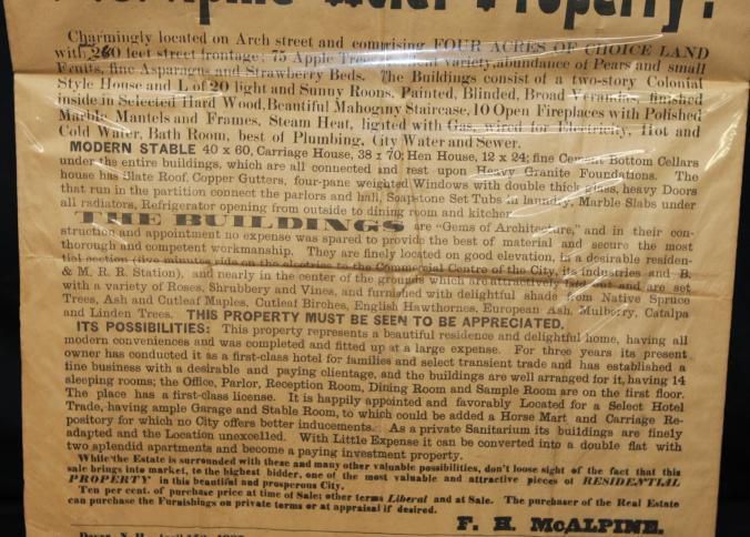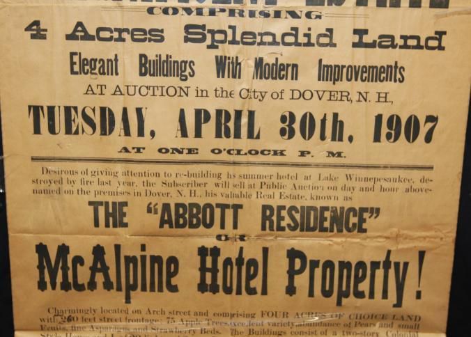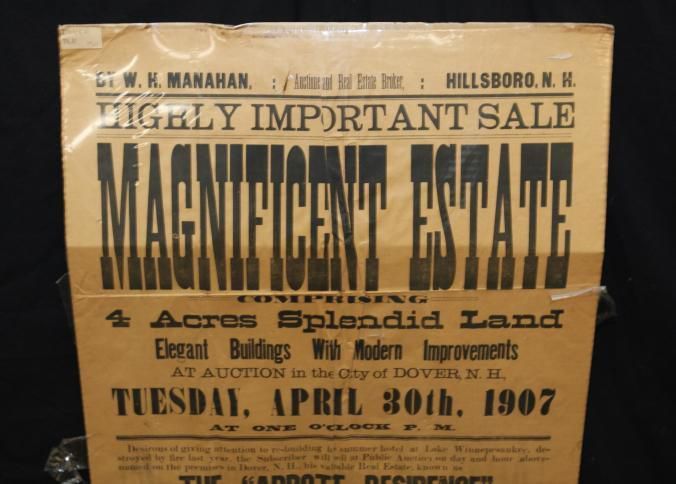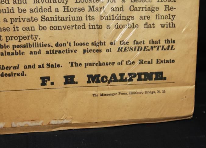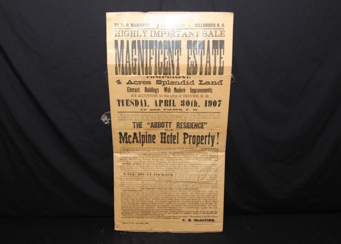 BROADSIDE IN PLASTIC. 1907, ESTATE, NH. W.H. MANAHAN, AUCTIONEER. HIGHLY IMPORTANT SALE, MAGNIFICENT ESTATE COMPRISING 4 ACRES SPLENDID LAND, ELEGANT BLDGS WITH MODERN IMPROVEMENTS. THE "ABBOTT RESIDENCE" OR MCALPINE HOTEL PROPERTY. 23" X 42 1/4"Created By