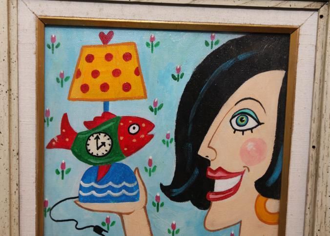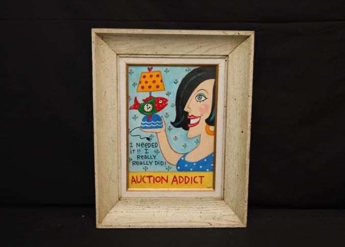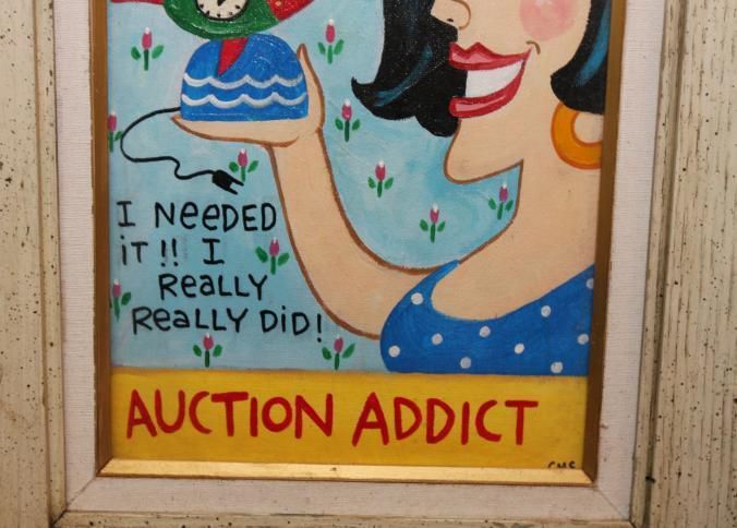 FR ARTWORK, PAINTING, "AUCTION ADDICT" SIGNED CMS. WOMAN WITH FISH CLOCK/LAMP AND QUOTE "I NEEDED IT, I REALLY REALLY DID!" 15" X 18"Created By