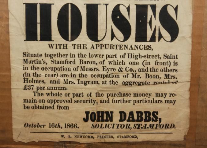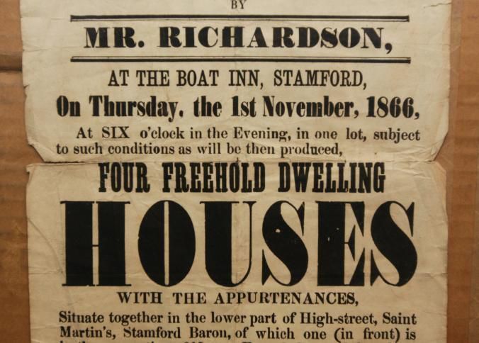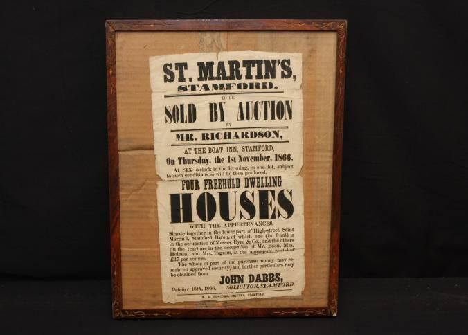 FR BROADSIDE, 1866, REAL ESTATE, STAMFORD. ST MARTINS TO BE SOLD BY AUCTION. MR RICHARDSON, AUCTIONEER. FOUR FREEHOLD DWELLING HOUSES. 13" X 16"Created By