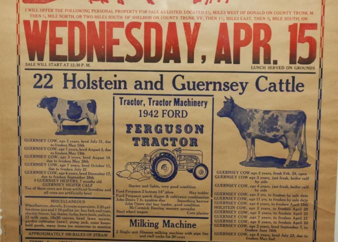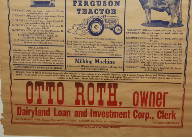 FR BROADSIDE, CATTLE, WI. DAIRYLAND LOAN & INVESTMENT CORPORATION. PUBLIC SALE, 22 HOLSTEIN & GUERNSEY CATTLE, 1942 FORD TRACTOR. COL. CLARENCE HUNT, COL. AUGUST JOHNSON, AUCTIONEERS. 22 1/4" X 26 1/4"Created By