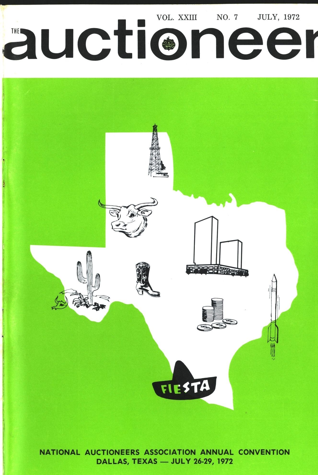 - (On the cover) "National Auctioneers Association Annual Convention, Dallas, Texas - July 26-29, 1972" with Illustrated Map of Texas with an oil derrick, a steer, coins, a cowboy boot, a cactus, a rocket, a sombrero, and the Fairmont Hotel in Dallas