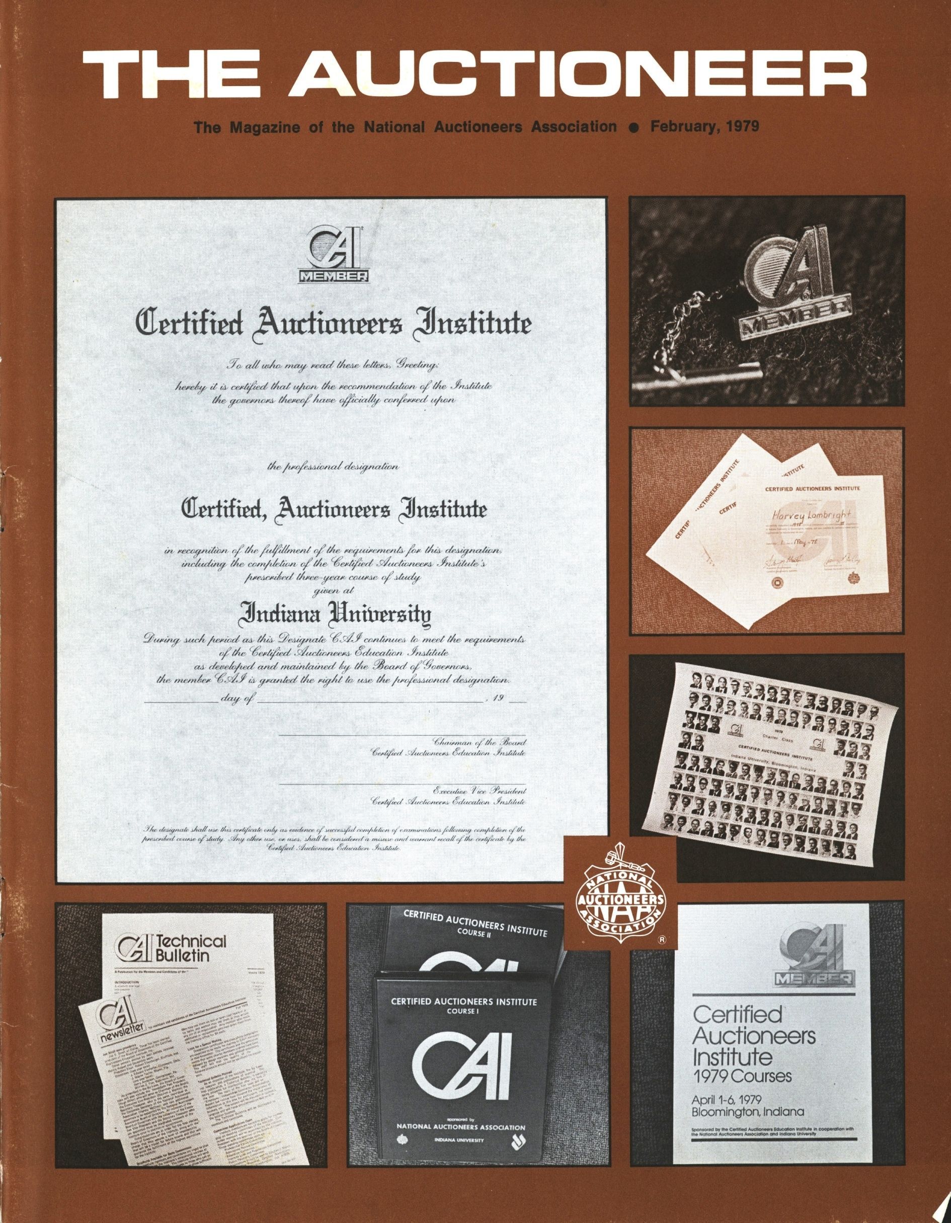 - (On the cover) Images representing the Certified Auctioneers Institute (lapel pin, course catalog, etc.) (photos)
