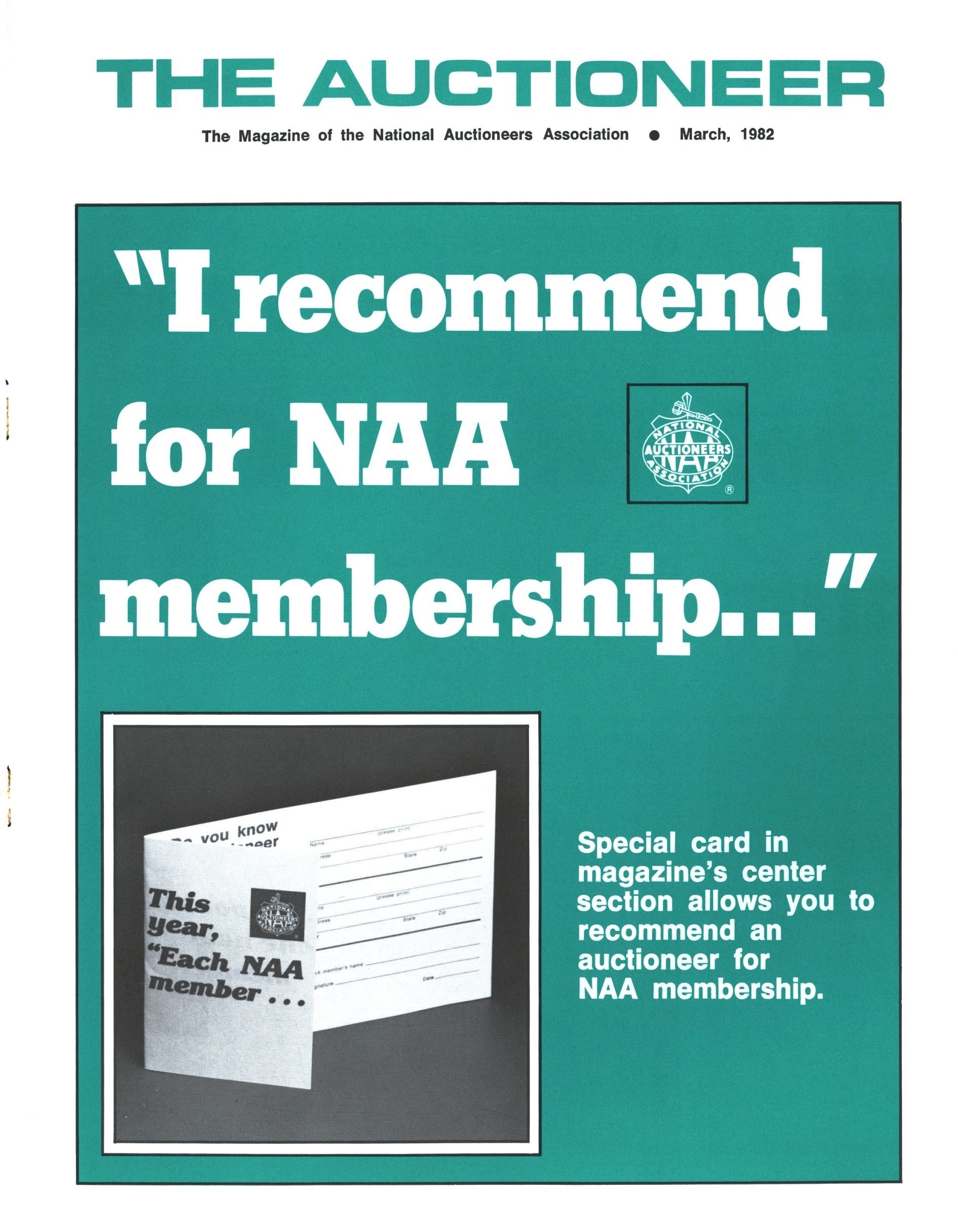 - (On the cover) "I recommend for NAA membership..." "Special card in magazine's center section allows you to recommend an auctioneer for NAA membership"