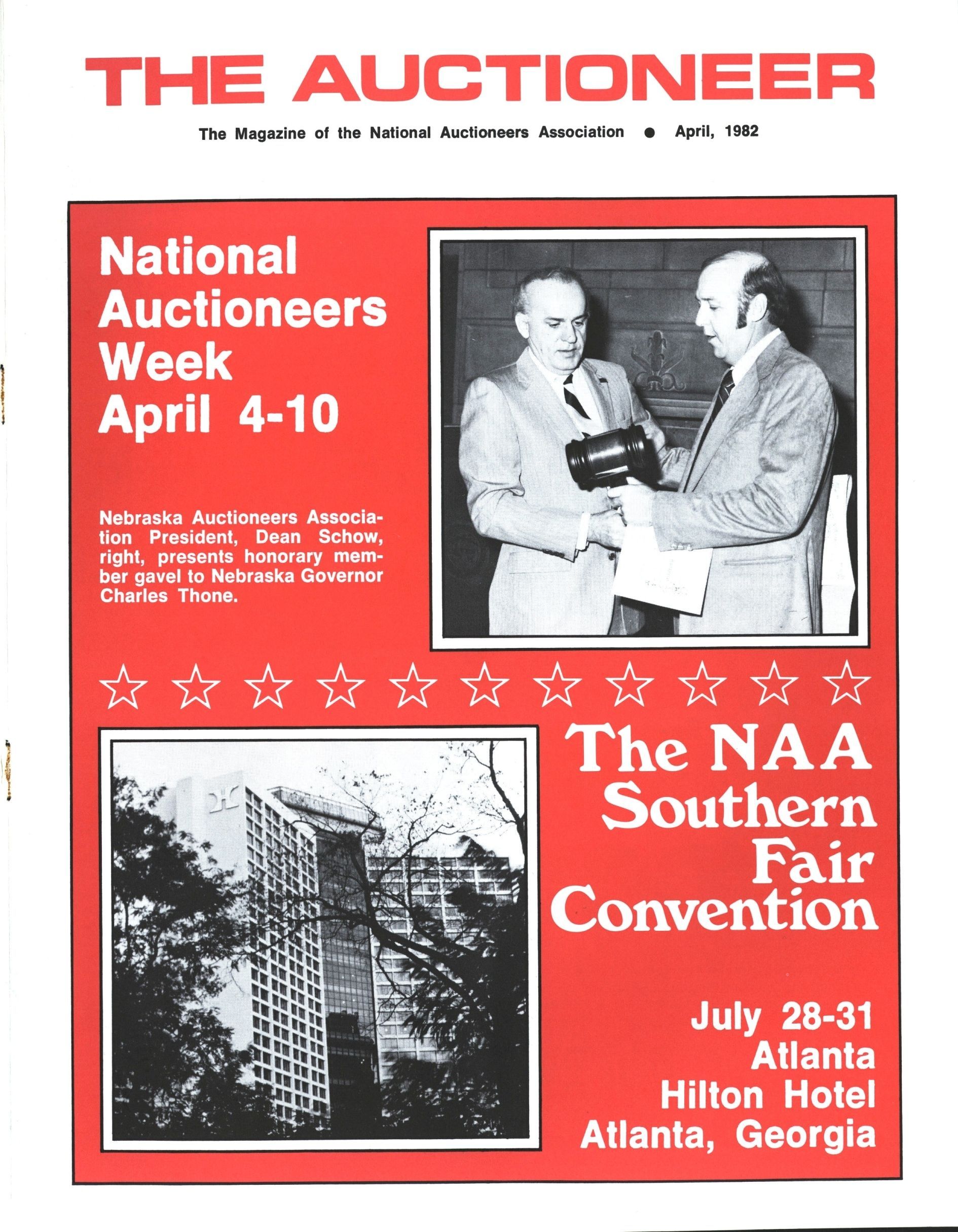 - (On the cover) "National Auctioneers Week April 4-10" with photo of Nebraska Auctioneers Association President Dean Schow presenting an honorary member gavel to Nebraska Governor Charles Thone. "The NAA Southern Fair Convention July 28-31" with