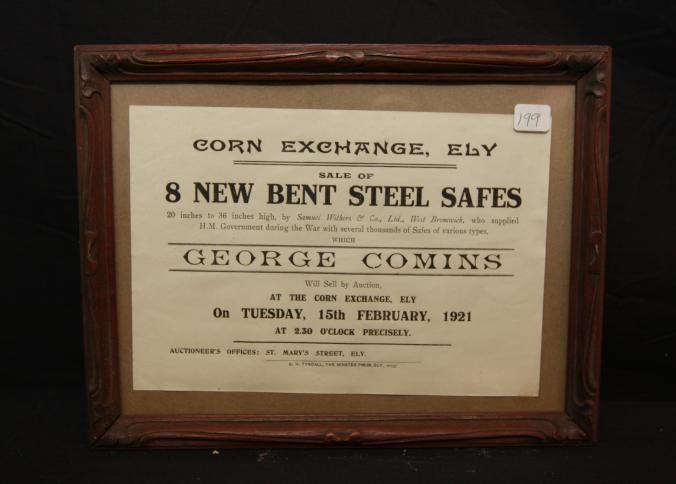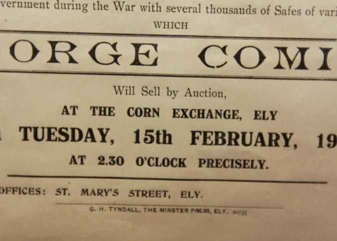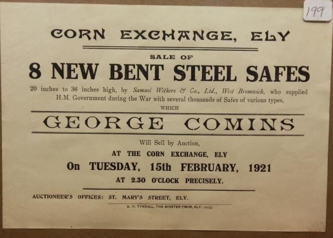 FR. 1921 BROADSIDE 8 1/2 X 5 1/2". AUCTIONEER GEORGE COMINS. SEVERAL THOUSAND OF HIS MAJESTIES SAFES OF VARIOUS SIZES FROM THE WAR.Created By