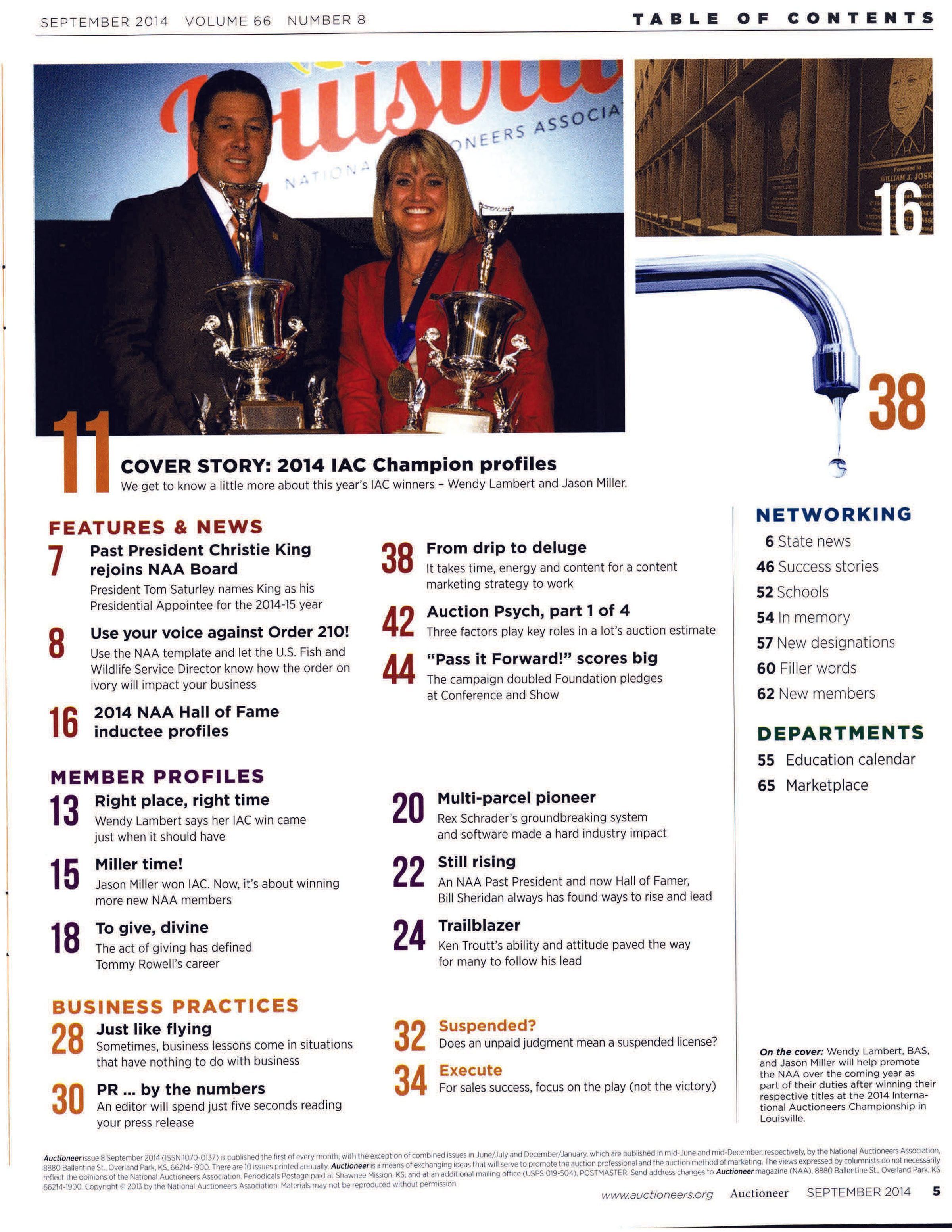 - (On the cover) IAC Champions: Wendy Lambert and Jason Miller. Also inside: Content Marketing, NAA Hall of Fame profiles, Auction Psych Part 1: The 3 E's
