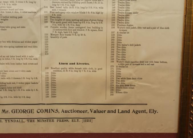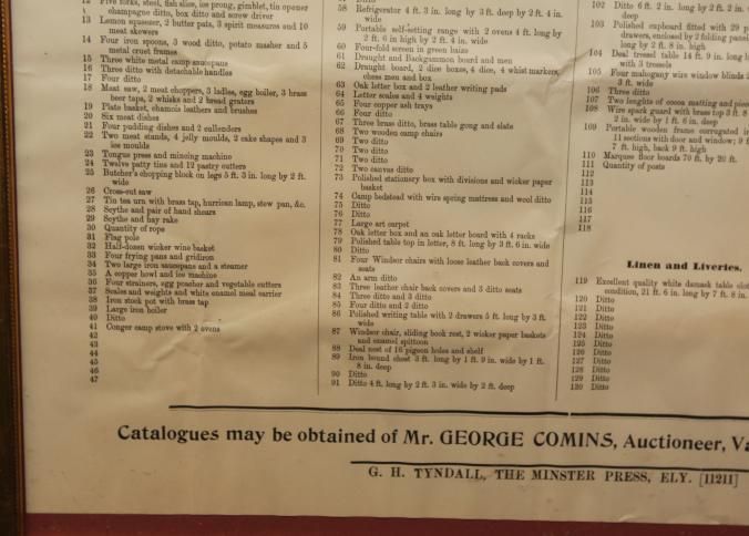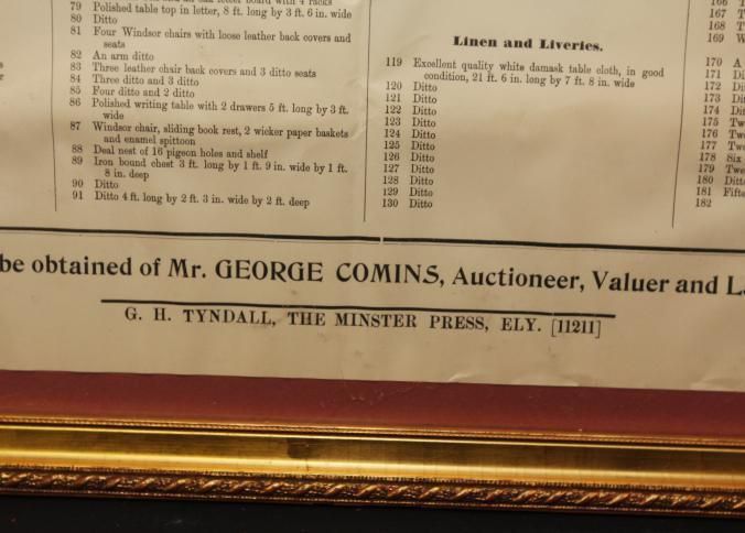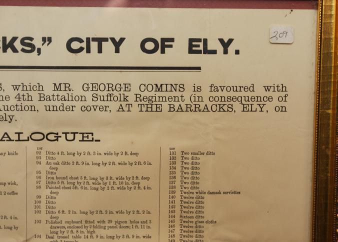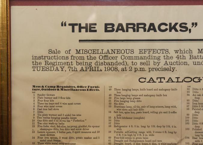 FR. 1908 CATALOG BROADSIDE FOR "THE BARRACKS" AUCTION. 15X18" GEORGE COMINS WAS TO SELL THE CONTENTS OF THE SIBANDED 4TH REGIMENT. AUCTION AT THE BARRACKS ELY.Created By