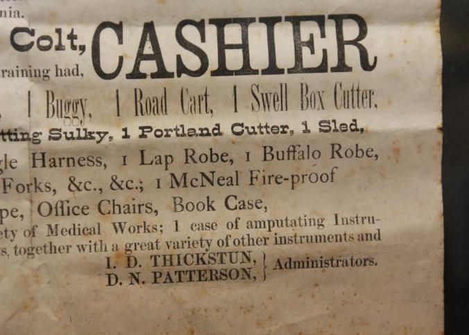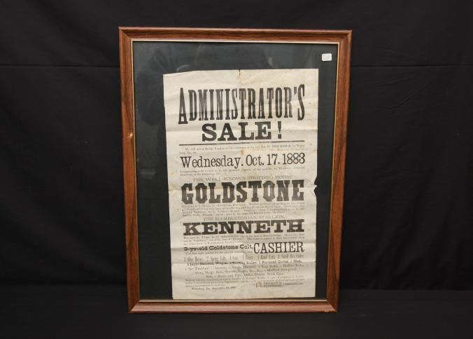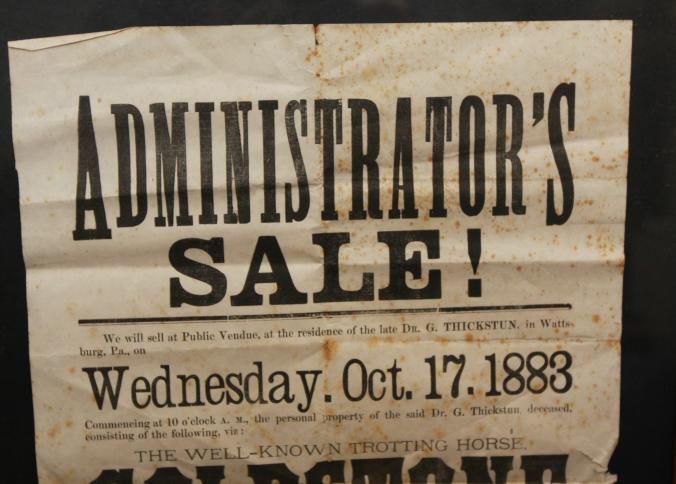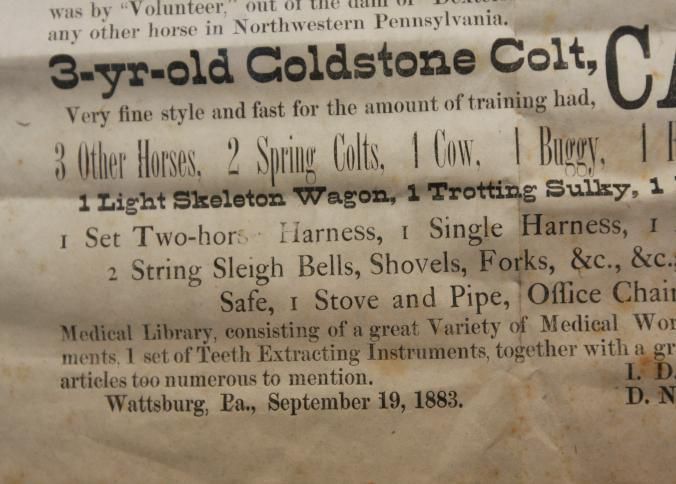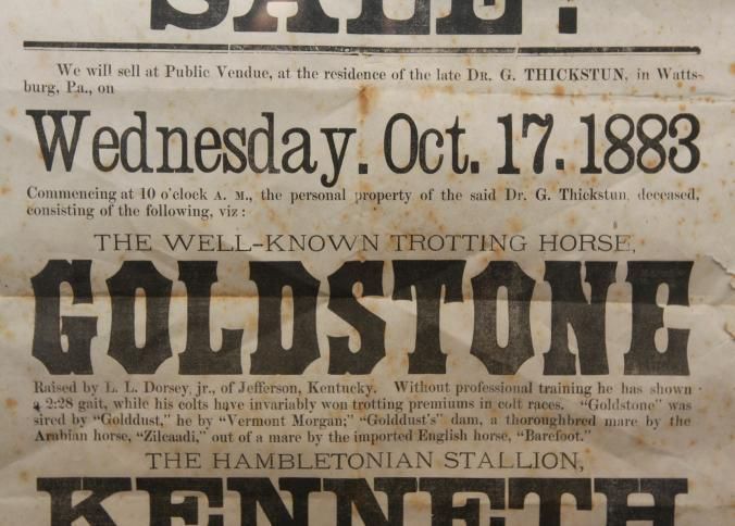 FR. 1883 PA TROTTING HORSE AUCTION BROADSIDE. 12X18". A "PUBLIC VENDUE AT THE RESIDENCE OF DR. G. THICKSTUN IN WATTSBURG, PA. "GOLDSTONE" WELL KNOWN TROTTING HORSE RAISED IN JEFFERSON, KENTUCKY. THIS IS A FABULLOUS BROADSIDE WITH INTERESTING LISTING AND INFORMATION. ITEMS INCLUDED "AMPUTATION & TEETH EXTRACTING INSTRUMENTS."Created By