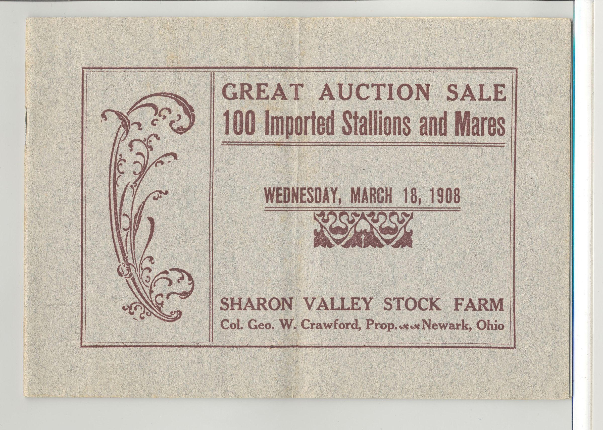 CAT, HORSE, 1908, OH. GREAT AUCTION SALE 100 IMPORTED STALLIONS & MARES. SHARON VALLEY STOCK FARM. FRED ANDREWS, AUCT. ILLUS B/W, 32 PP. 8 1/2" X 6"Created By