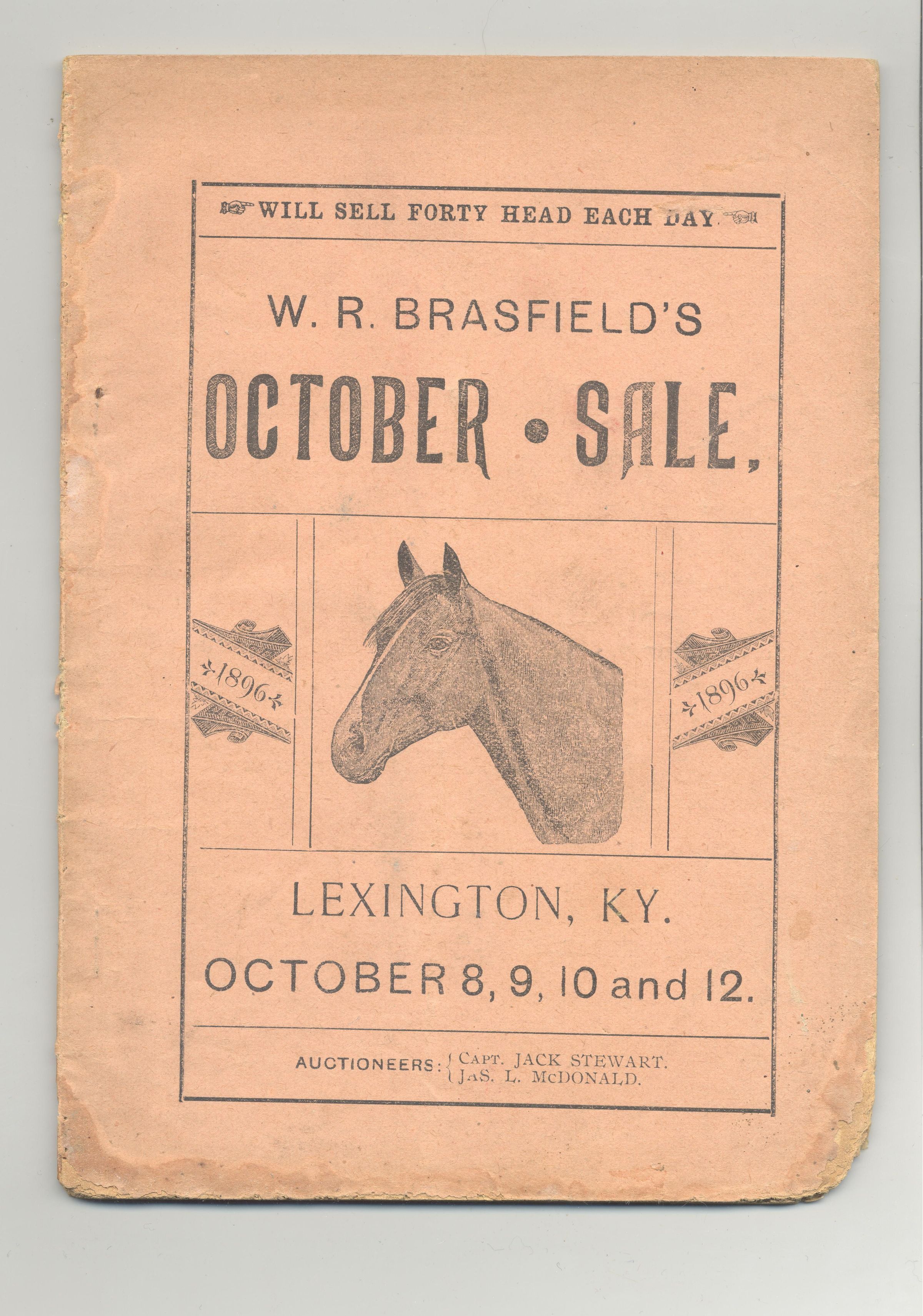 CAT, HORSE, 1896, KY. W.R. BRASFIELD'S OCTOBER SALE. CAPT JACK STEWART, JAS. L. MCDONALD, AUCTS. 56 PP. 5 3/8" X 7 1/2"Created By