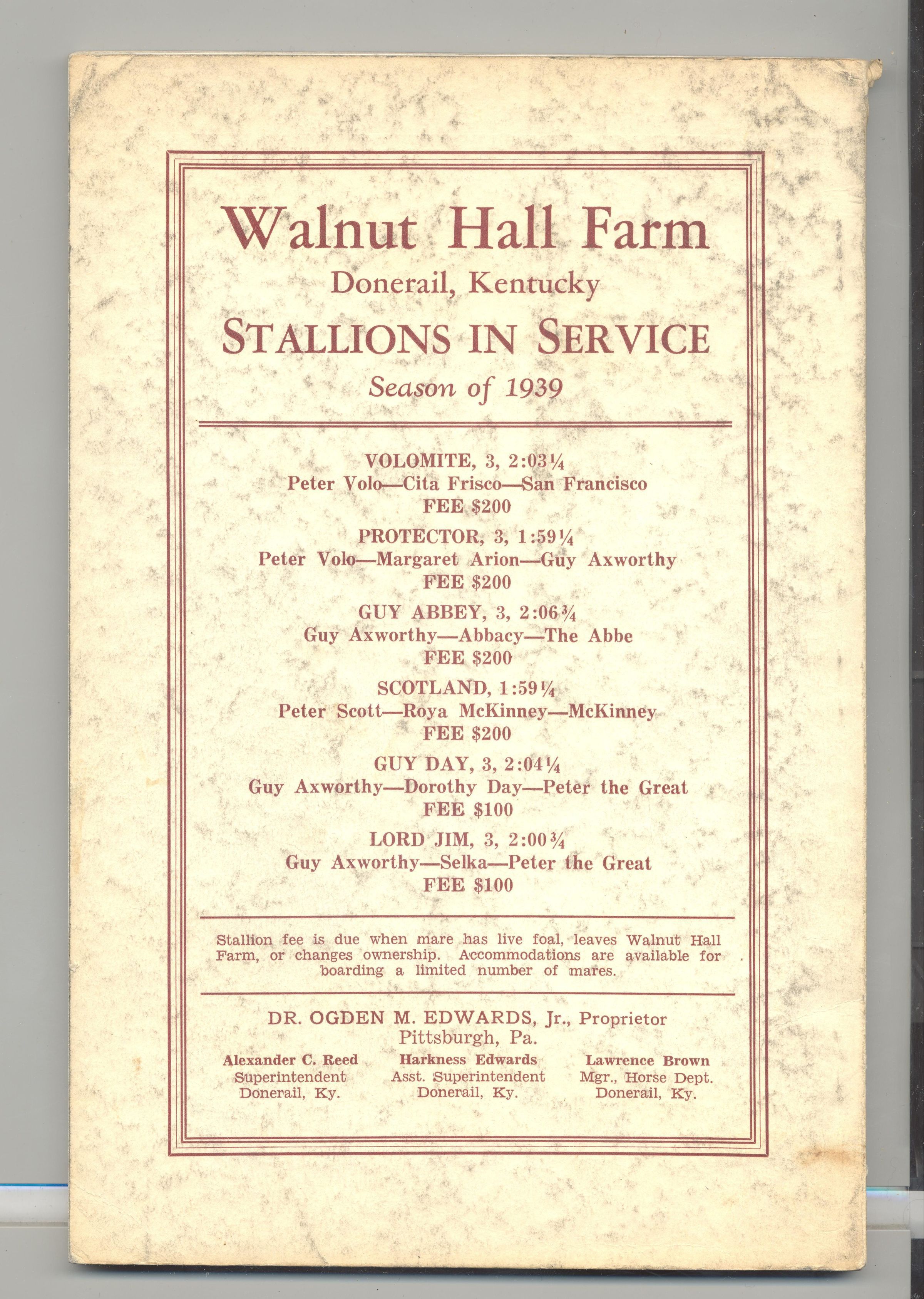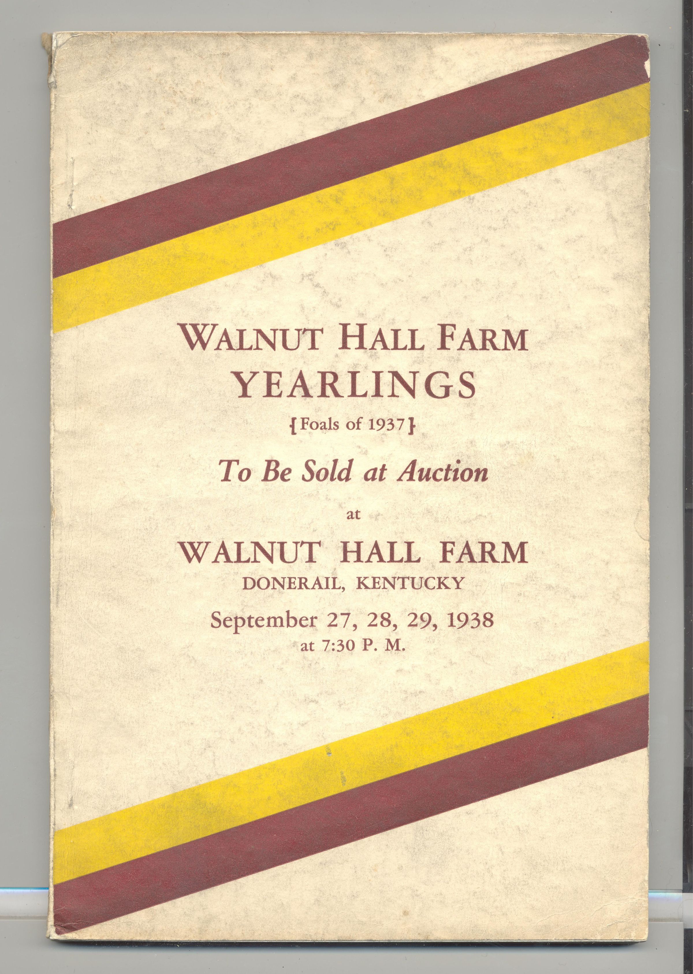CAT, HORSE, 1938, KY. WALNUT HALL FARM YEARLINGS, FOALS OF 1937. KENTUCKY SALE CO. PRICES WRITTEN, 124 PP. 6" X 9"Created By