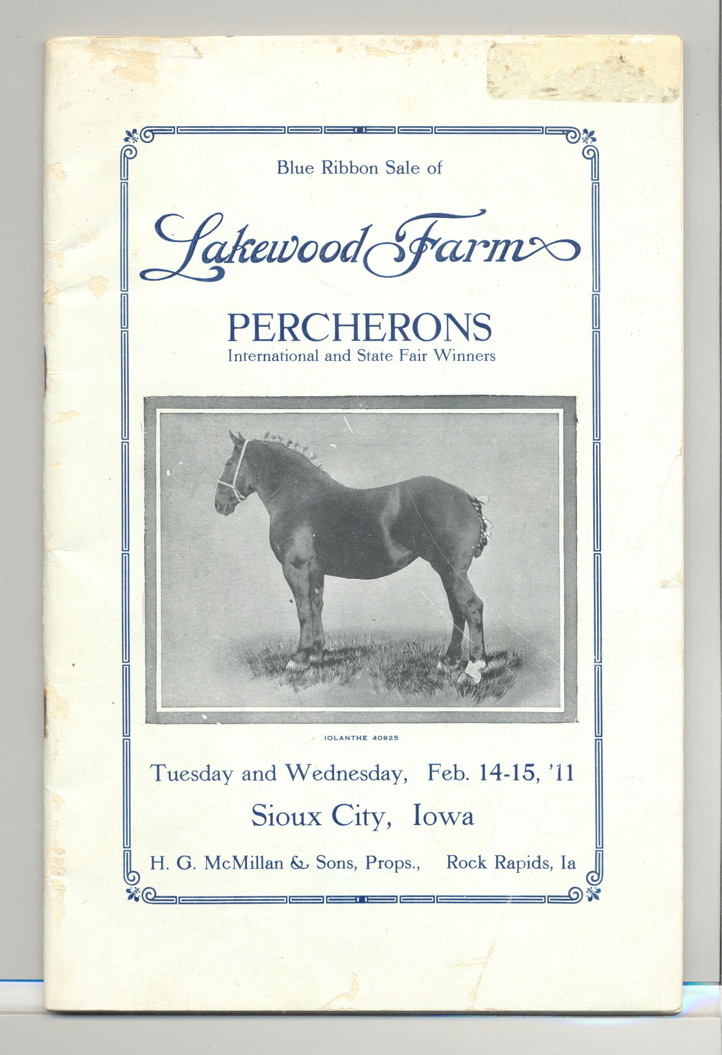 CAT, HORSE, 1911, IA. BLUE RIBBON SALE OF LAKEWOOD FARM PERCHERONS. WOODS, JONES, MCGUIRE, AUCTS. 64 PP. 6" X 9"Created By