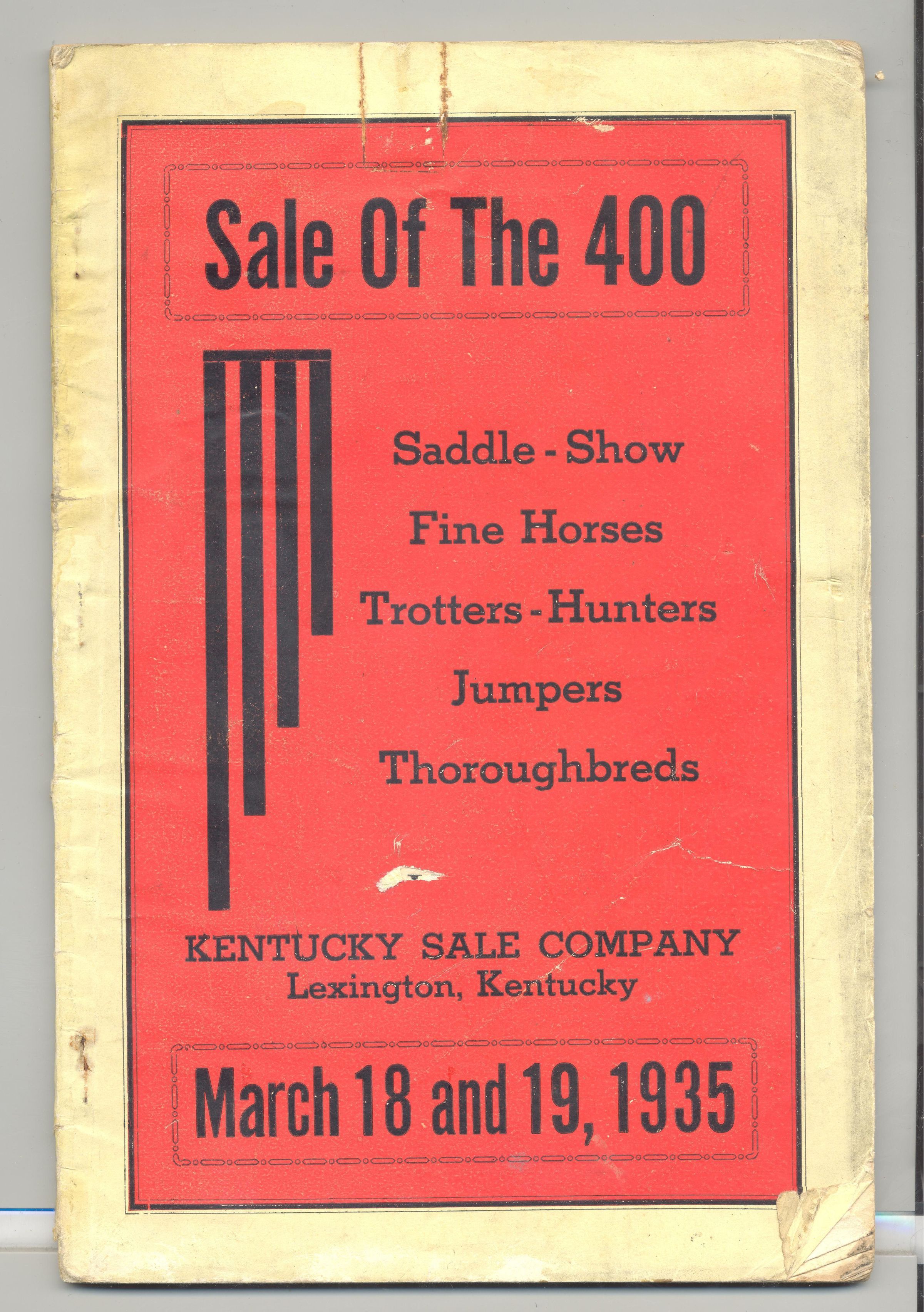 CAT, HORSE, 1935, KY. SALE OF THE 400, KENTUCKY SALE CO. GEORGE BAIN, AUCT. PRICES WRITTEN, 6" X 9" X 3/16"Created By