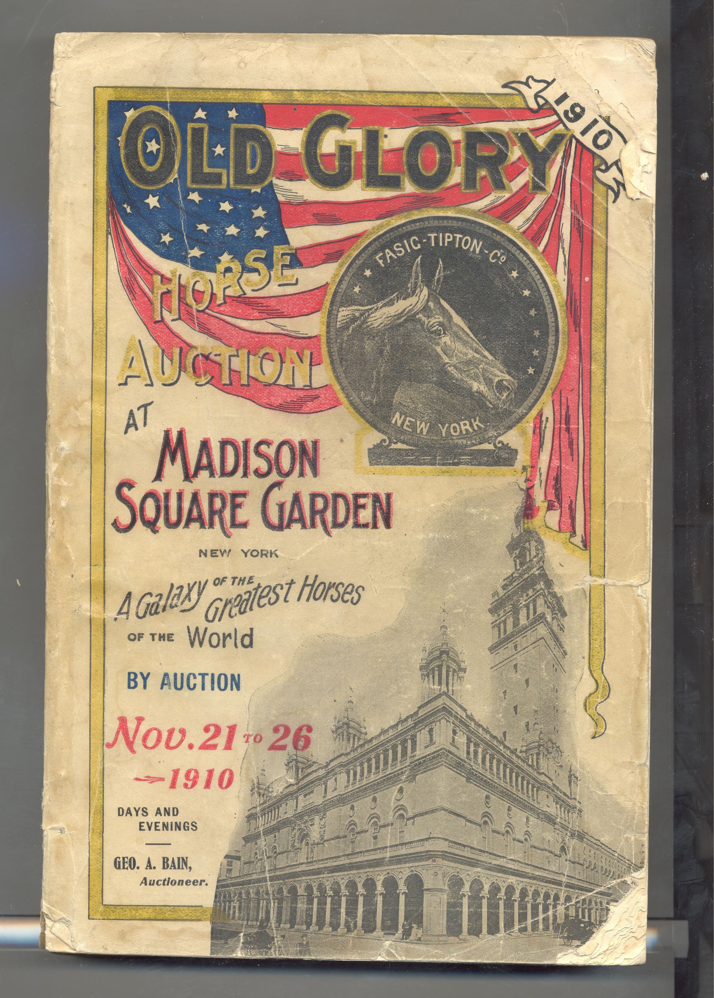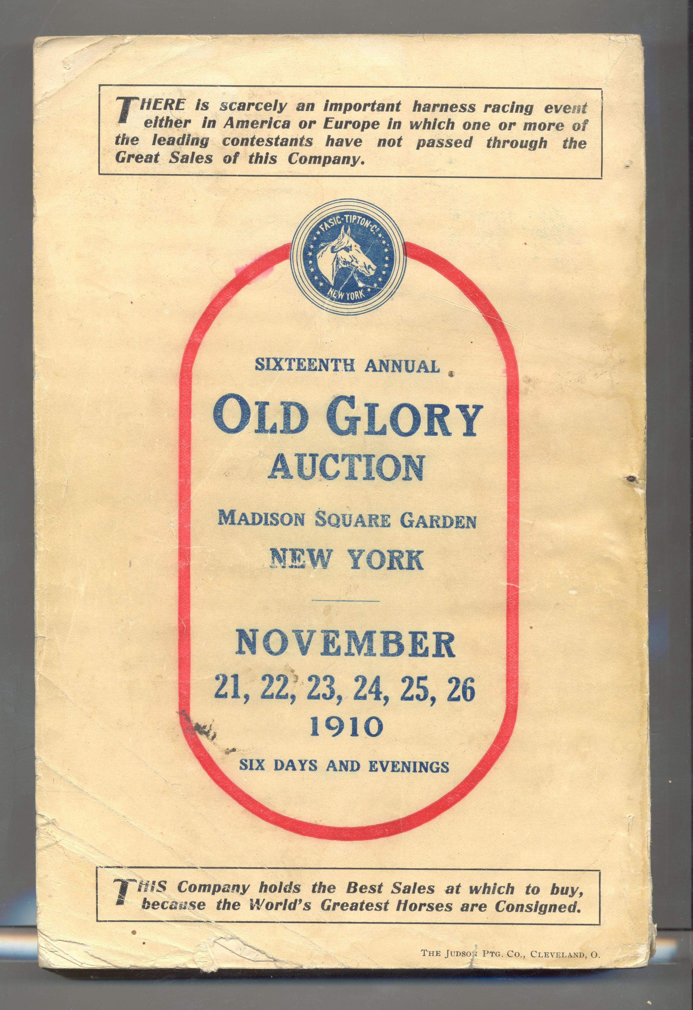 CAT, HORSE, 1910, NY. OLD GLORY HORSE AUCTION, "A GALAXY OF THE GREATEST HORSES OF THE WORLD" FASIG-TIPTON CO, GEORGE BAIN, AUCT. 6" X 9" X 1" PAGES NOT NUMBERED.Created By