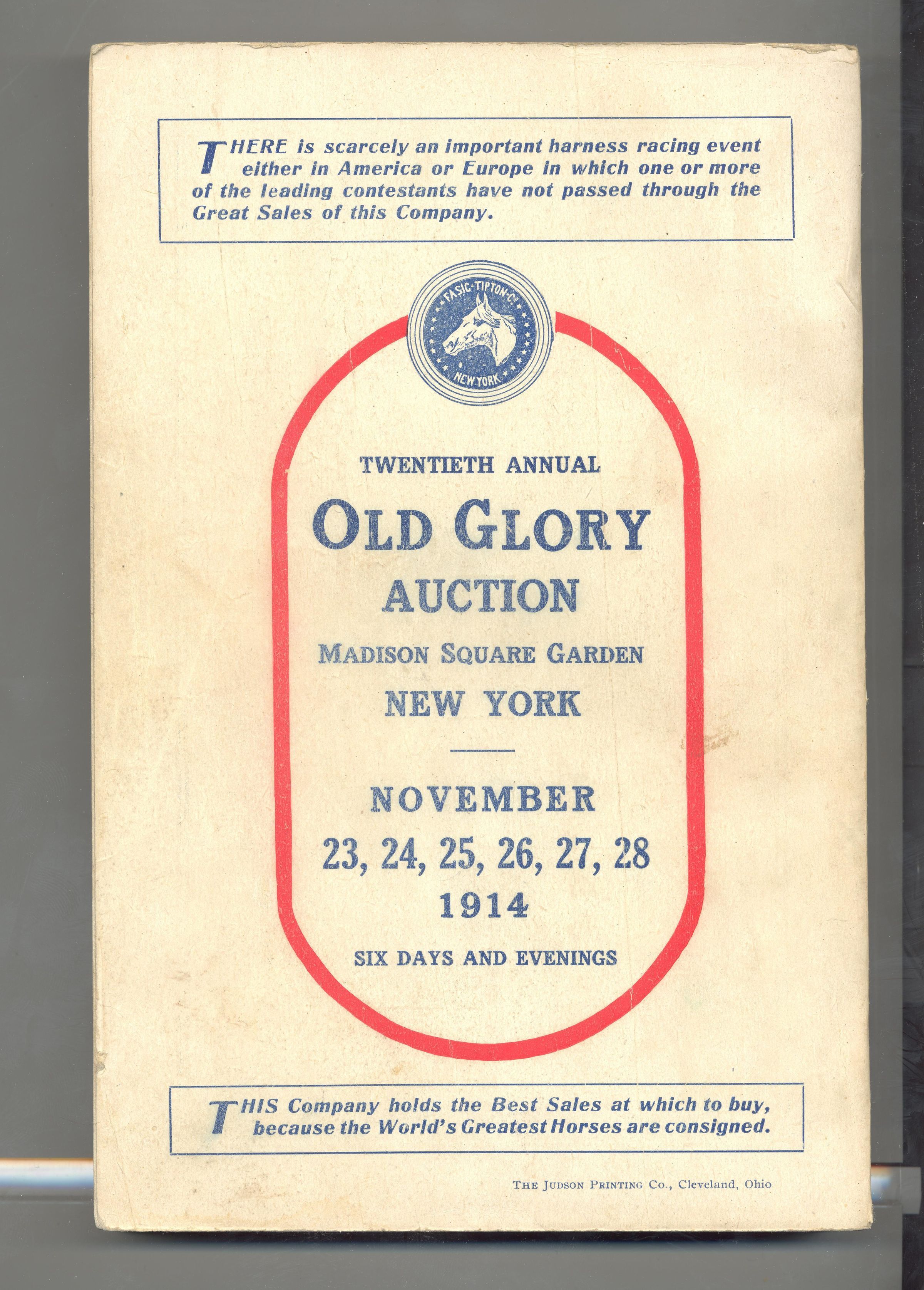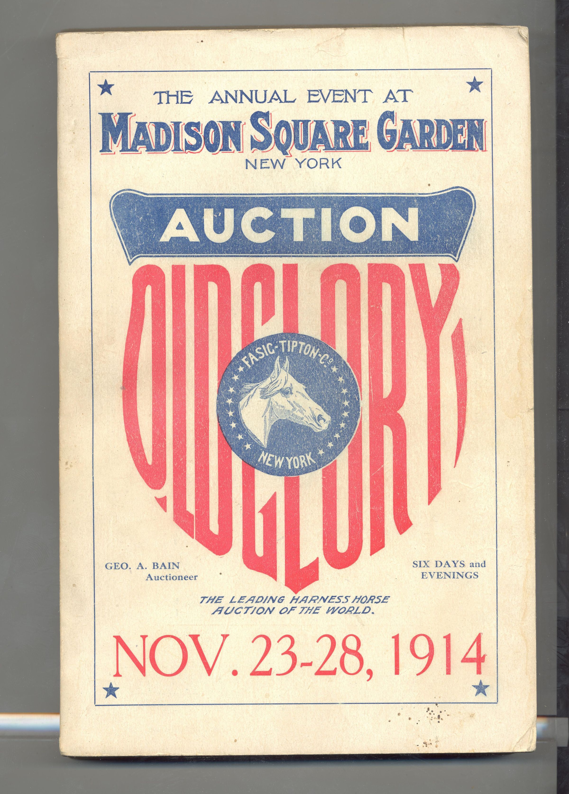 CAT, HORSE, 1914, NY. OLD GLORY HORSE AUCTION, "THE LEADING HARNESS HORSE AUCTION OF THE WORLD" FASIG-TIPTON CO, GEORGE BAIN, AUCT. 6" X 9" X 1" PAGES NOT NUMBERED.Created By