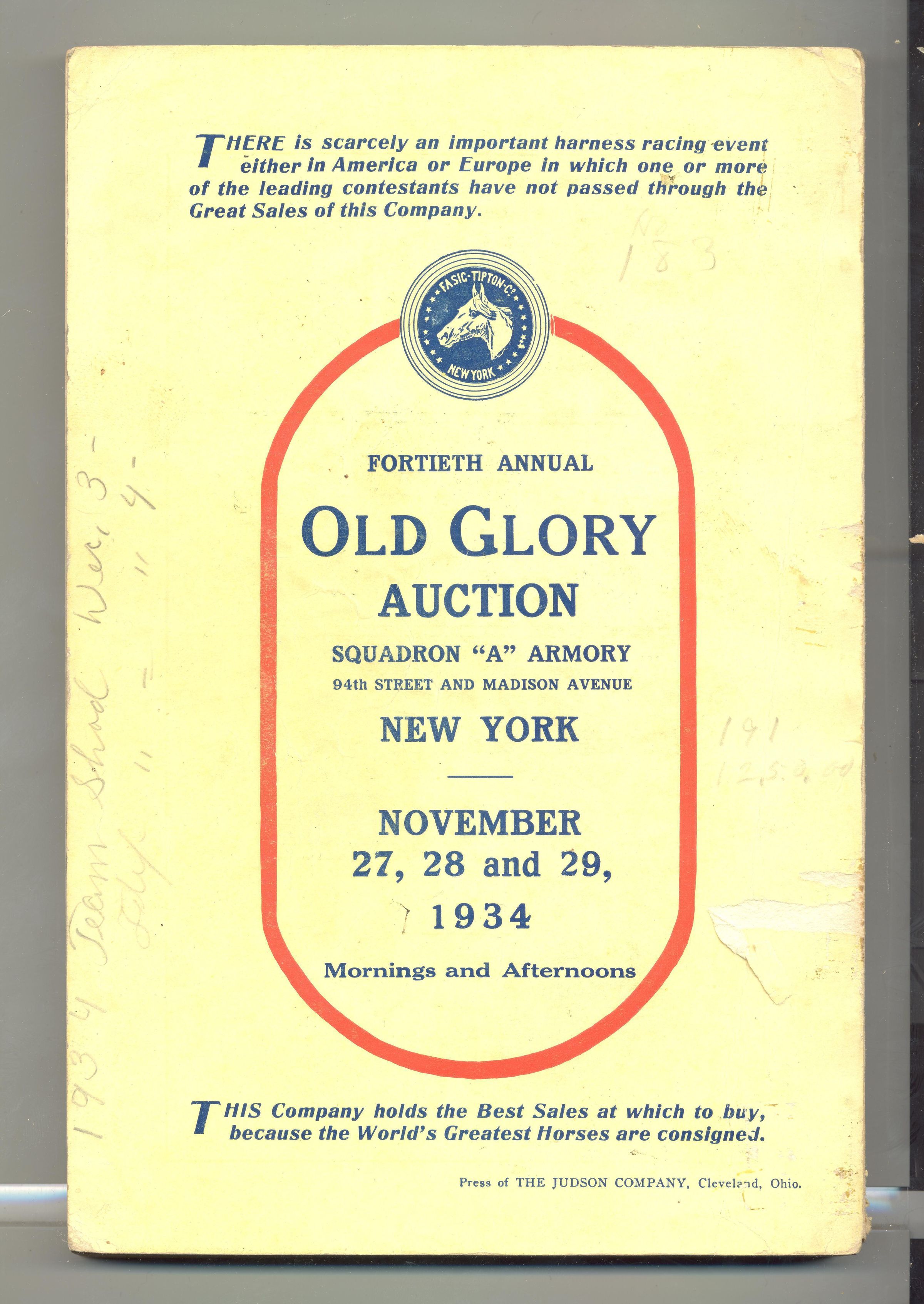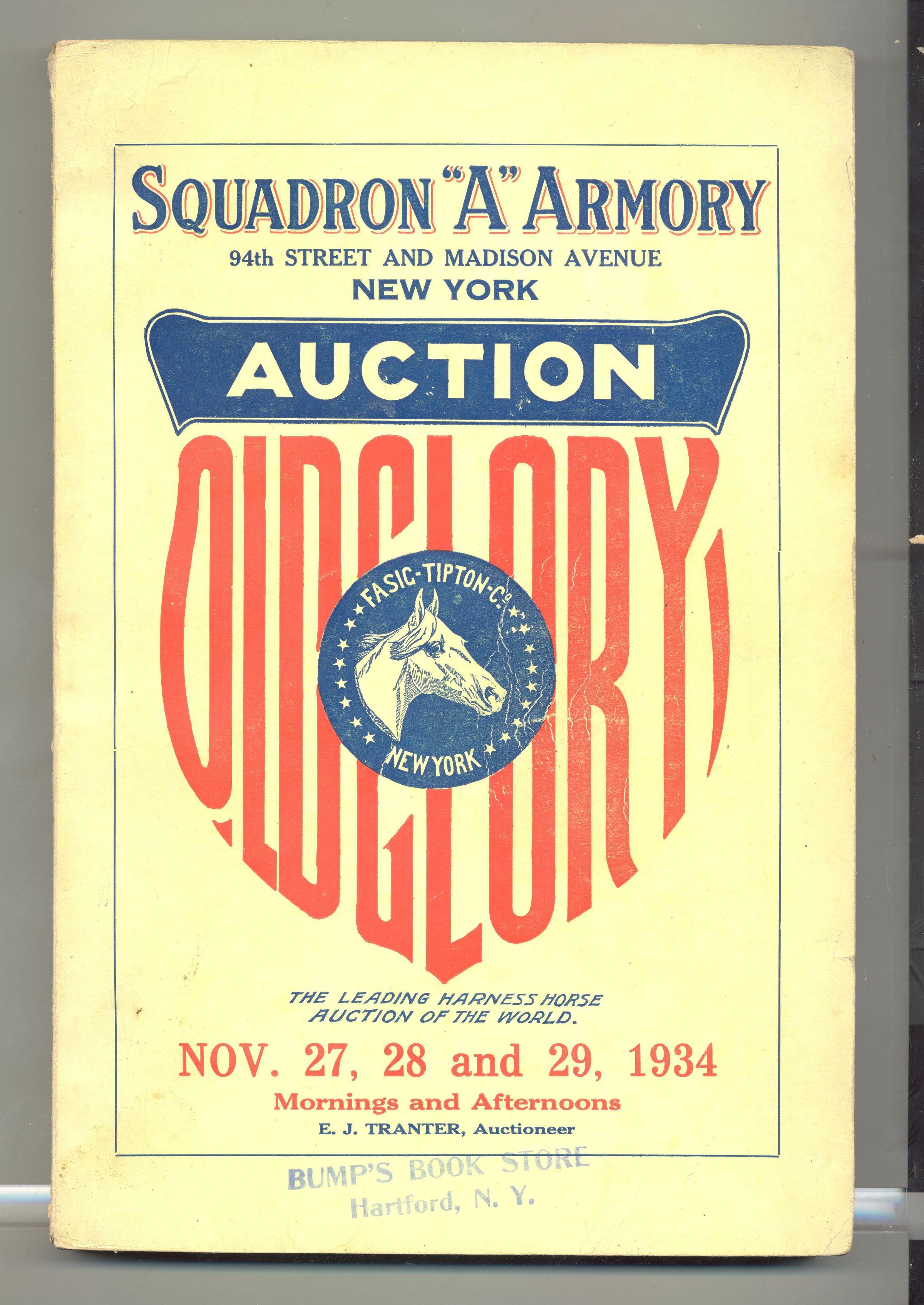 CAT, HORSE, 1934, NY. OLD GLORY HORSE AUCTION, "THE LEADING HARNESS HORSE AUCTION OF THE WORLD" FASIG-TIPTON CO, E.J. TRANTER AUCT. PRICES WRITTEN IN. 6" X 9" X 1/2" PAGES NOT NUMBERED.Created By