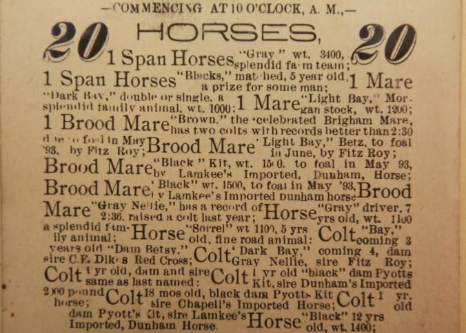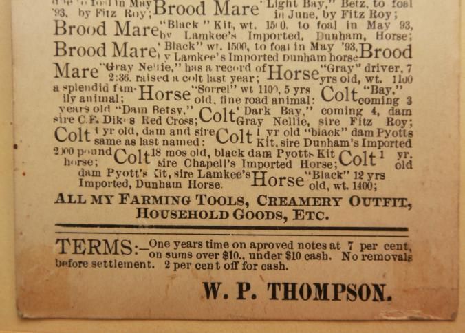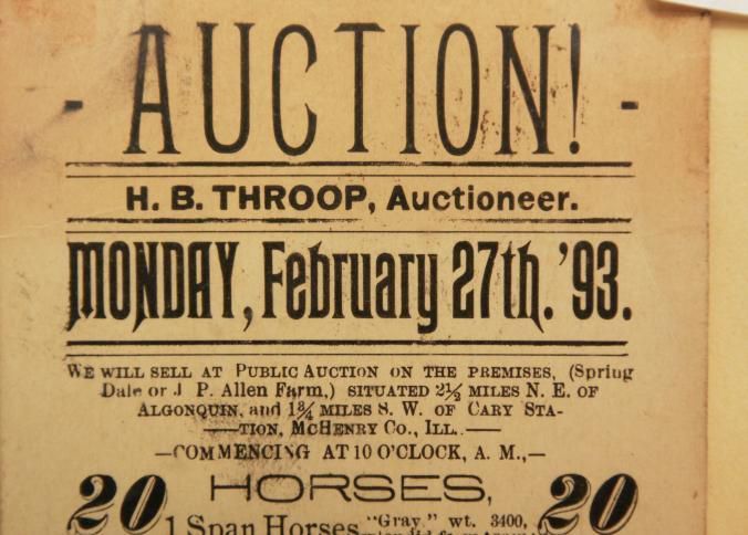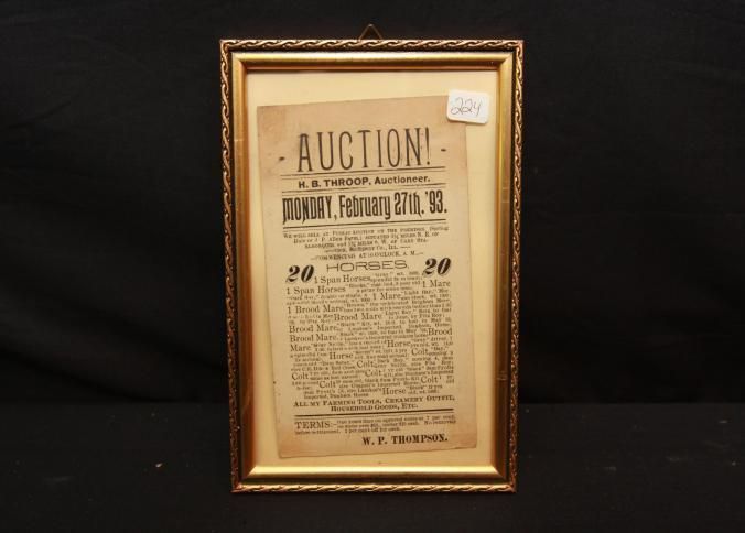 FR. 1893 ILL. HORSE AUCTION CARD. 4X6" AUCTIONEER: H.B. THROOP. LOTS OF HORSES, COLTS, FARMING TOOLS, CREAMERY OUTFIT AND HOUSEHOLD GOODS.Created By