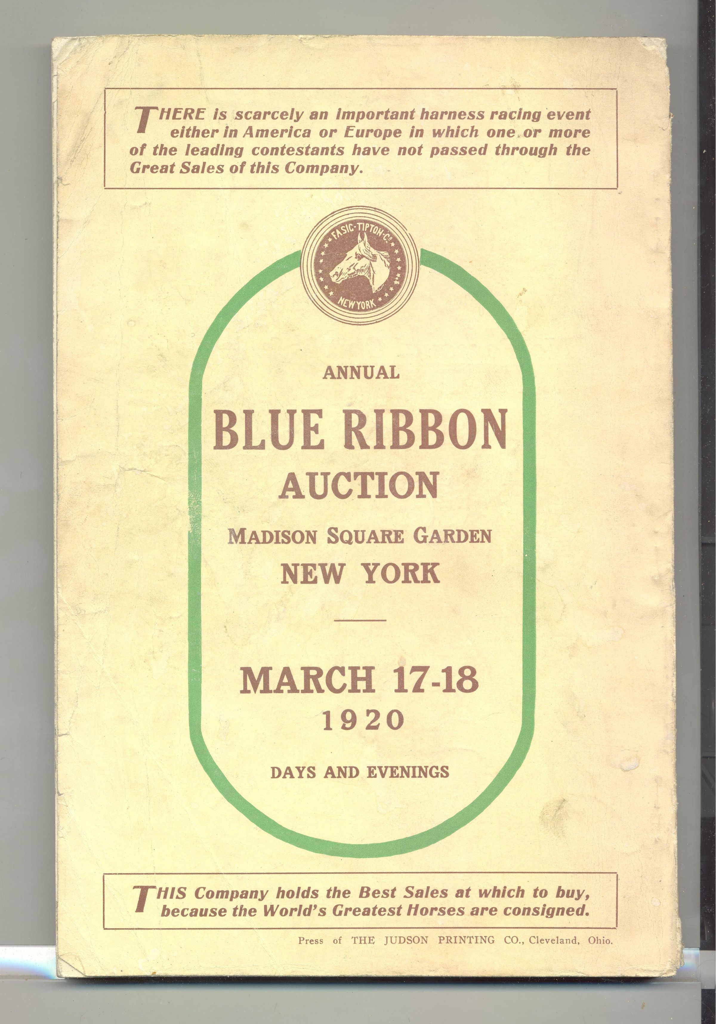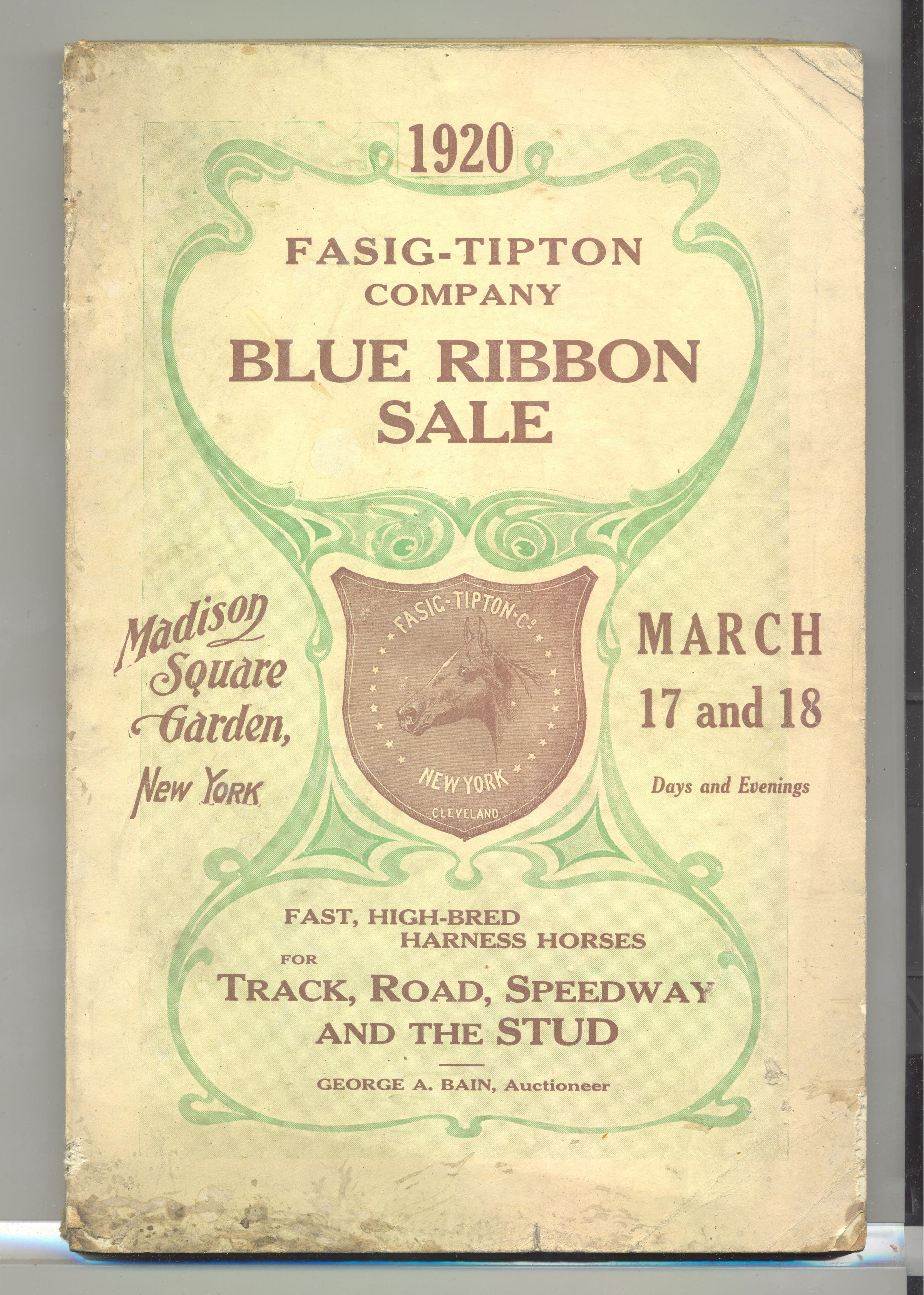 CAT, HORSE, 1920, NY. FASIG-TIPTON CO. BLUE RIBBON SALE. GEORGE BAIN, AUCTIONEER. "FAST, HIGH-BRED HARNESS HORSES FOR TRACK, ROAD, SPEEDWAY AND THE STUD" PAGES NOT NUMBERED. 6" X 9" X 3/8"Created By