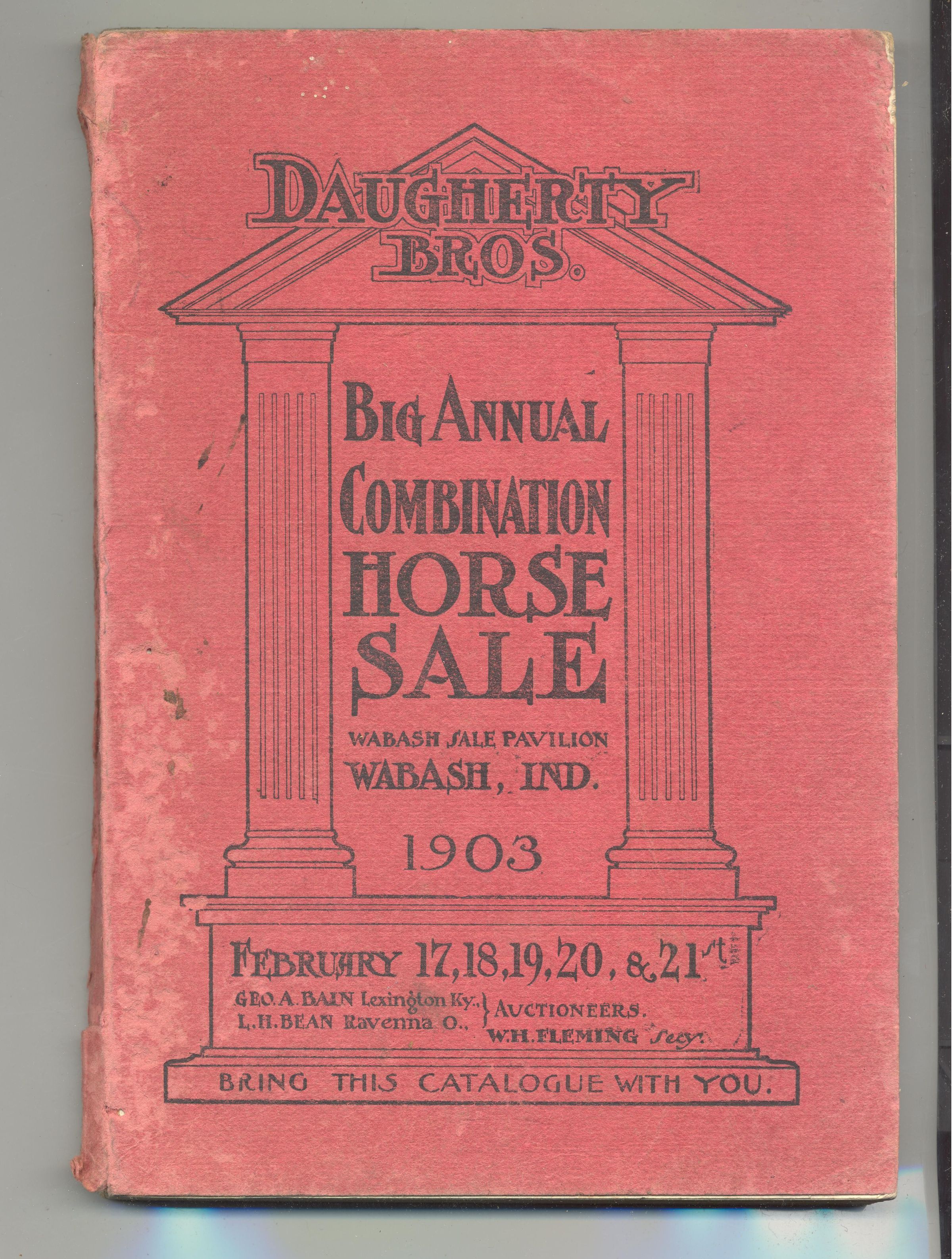 CAT, 1903, HORSE, IN. DAUGHERTY BROS. BIG ANNUAL COMBINATION HORSE SALE, WABASH SALE PAVILION. GEORGE BAIN, L.H. BEAN, AUCTIONEERS. SOME PHOTOS, 231 PP. 5 1/4" X 7 3/4"Created By